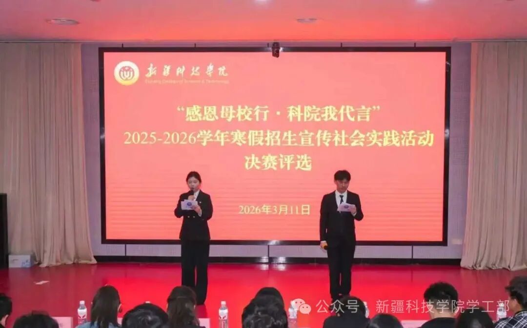 经过各二级学院严谨初评,最终推选出39名参赛个人、13支参赛团队晋级校级决赛,同台竞技、展现实力。比赛现场,参赛选手们各展所长,既有对招生宣传形式的创新探索,也有对实践过程的细致复盘,更有结合中学师生反馈为学校招生工作提出的宝贵建议。他们以青春之姿讲述科院故事,以亲身实践传递科院温度,不仅展现了新疆科技学院学子扎实的表达能力与实践能力,更让招生宣传的种子在全国各地的中学落地生根。现场观众均为本次寒假招生宣传社会实践活动的参与者,在观摩学习中相互交流经验,凝聚起更多投身校园宣传的青春力量。