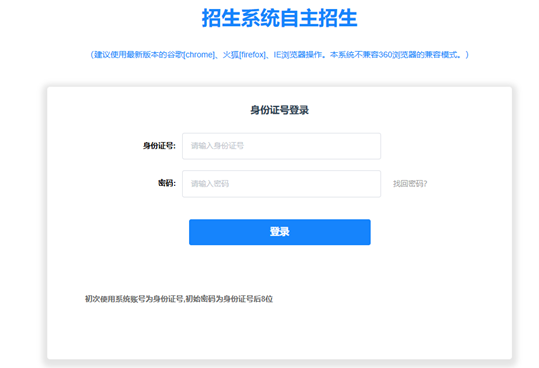 ① 进入自主招生系统页面首页,输入身份证号和密码。登录系统如遇到问题可拨打技术服务电话:15806345877。