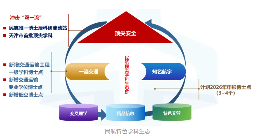 春风浩荡满目新,鹰击长空正当时。“十五五”时期,作为中国民航最高学府,中国民航大学坚决扛起支撑民航自立自强和国际竞合的使命责任。七十五载深耕行业,学校已然铸就不可替代的贡献底色;新时代多方协同,更注入迈向一流的磅礴动能。在中国民用航空局、天津市政府、教育部三方共建的坚强领导,以及民航局与天津市政府持续战略支持和资源赋能下,学校已积蓄起顶尖学科突破、领军人才培养、核心技术攻坚和创新生态构建的强大势能。立足研究型特色类大学办学定位,中国民航大学的“双一流”建设征途,是一条坚定不移的特色发展之路——摒弃同质化竞争,在服务交通强国战略中追求不可替代、不可或缺的核心价值!