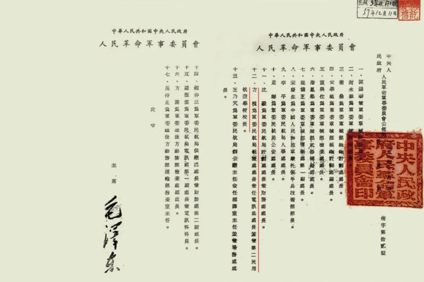 中央军委主席毛泽东批复民航局有关首任校长方槐的任命书