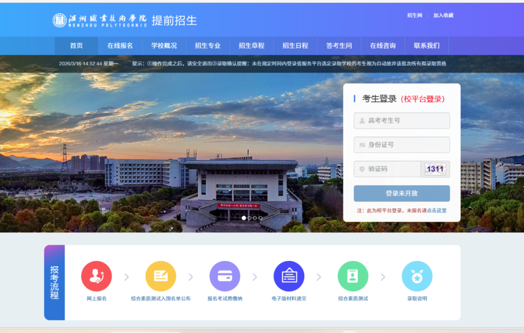 我校2026年提前招生报名已经结束,根据《温州职业技术学院2026年高职提前招生章程》规定,学校已按各专业招生计划数的500%确定综合素质测试入围考生名单(若报考人数未达到该专业招生计划数的500%,则符合该专业报考条件的考生均入围综合素质测试;若某一专业入围资格线出现多名考生总分相同则一并入围)。现将入围分数线、入围查询及缴费等有关事项公告如下: