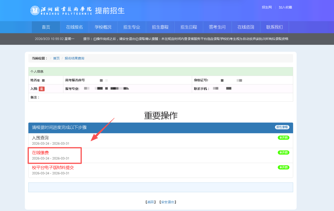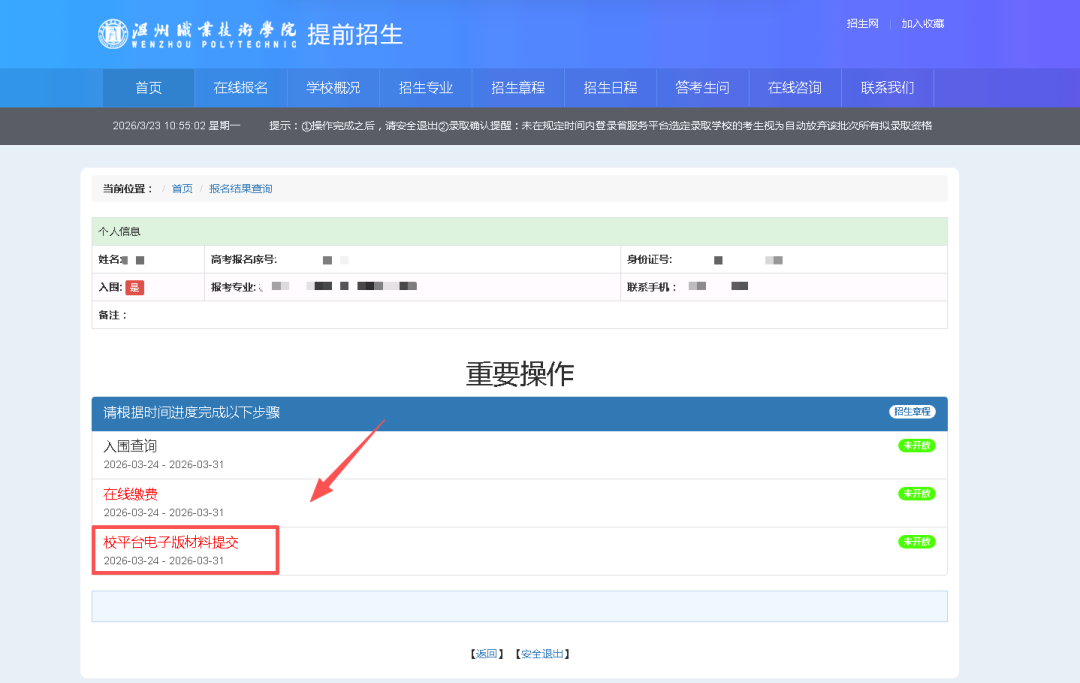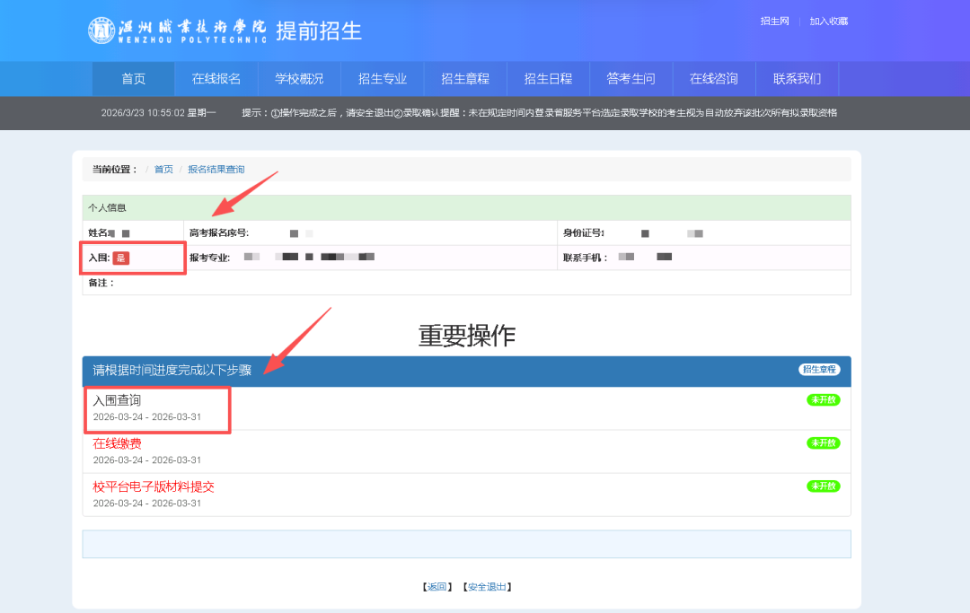 考生可登录我校提前招生网(https://tqzs.wzvtc.cn/)查询,也可以前往学校官网点击浮窗查询,具体查询方法如下: