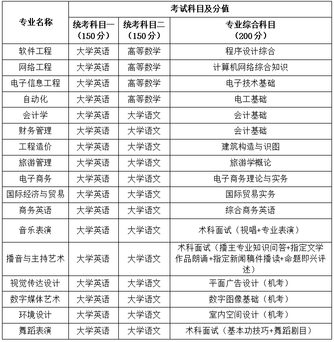 第十三条 普通生(含脱贫家庭毕业生)实行笔试或面试等方式进行考试。考试科目由公共科目和专业综合科目组成。公共科目实行省级统一命题、统一制卷,学校根据专业人才培养要求选择大学英语,大学语文或高等数学2门科目;专业综合科目由我校自行命题。考试安排如下: