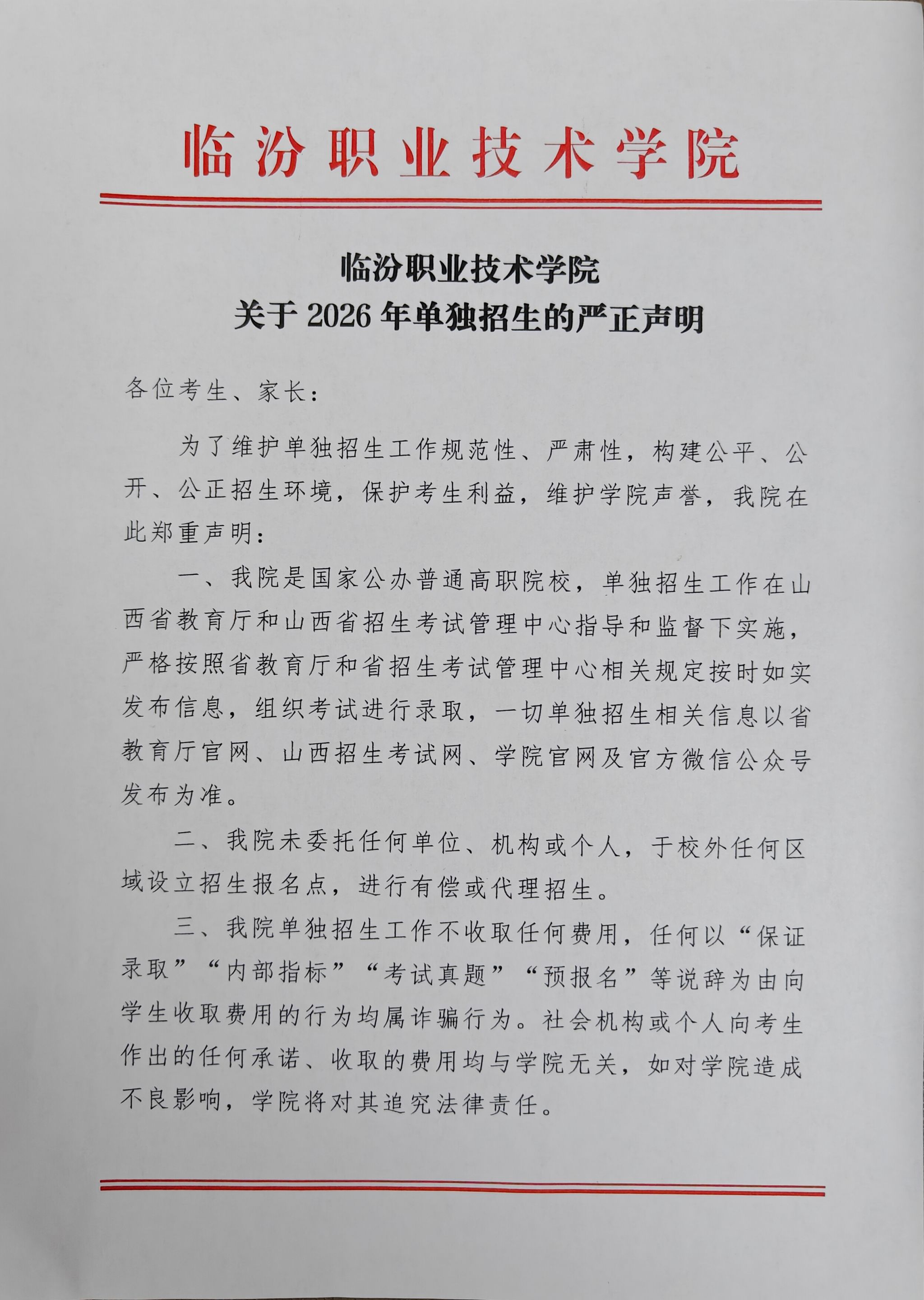 临汾职业技术学院关于 2026 年单独招生的严正声明