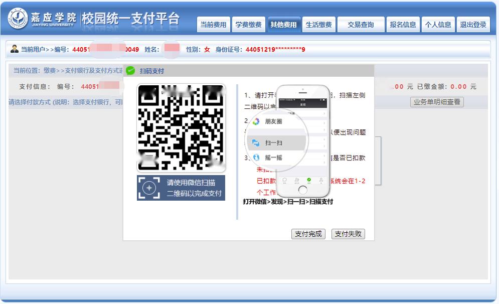 2.点击其他费用,然后点击下一步,核对姓名等信息,确认无误后点击下一步确认使用微信扫码支付。