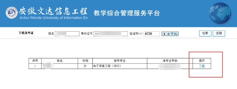 2.填写信息检索:在页面对应输入框中准确填写姓名、身份证号及验证码,填写完成后点击页面右上角检索按钮,按提示完成准考证的下载与打印。