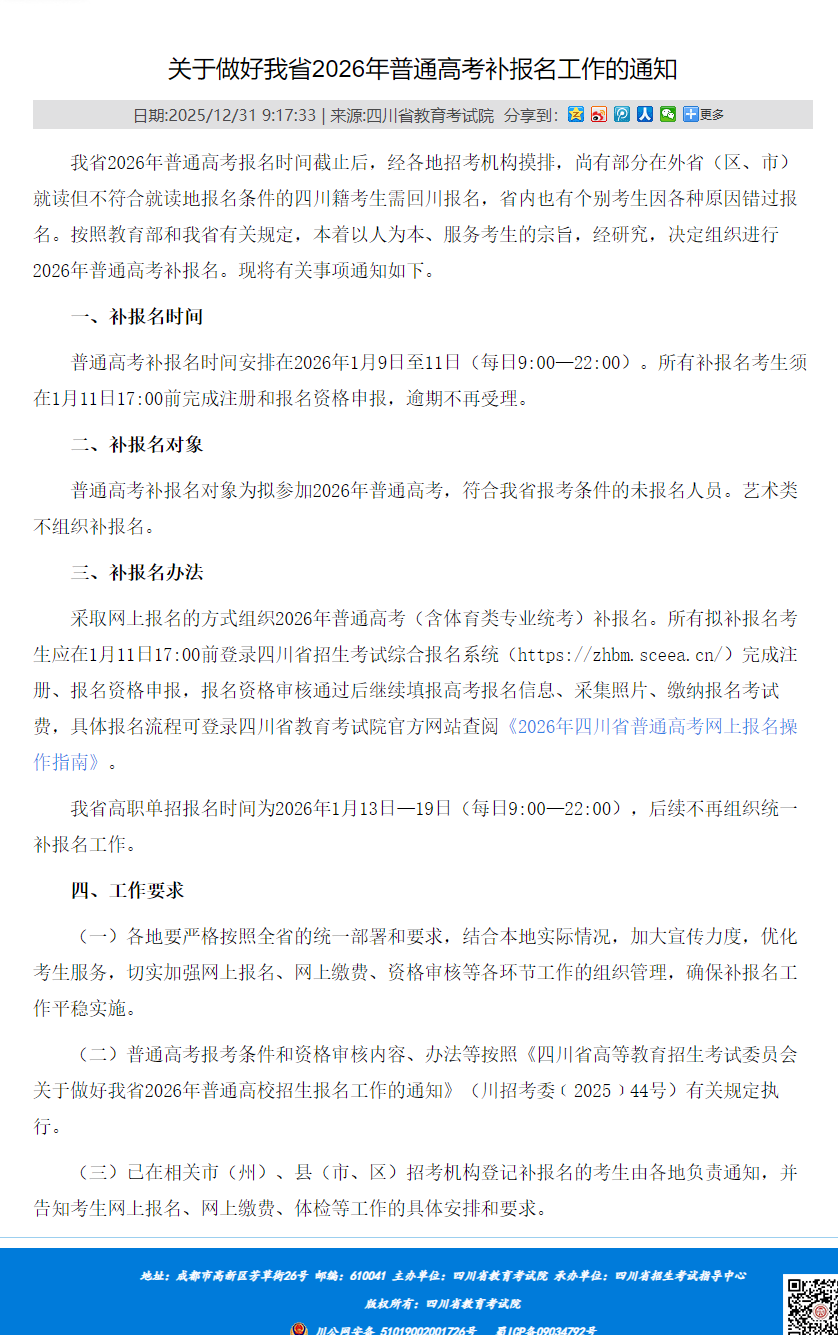 关于做好我省2026年普通高考补报名工作的通知