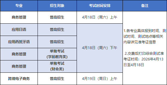 3.学校综合素质测试时间为2026年4月18-19日。各专业考试安排如下,具体场次报到测试时间、地点等相关内容详见准考证信息,交费后打印综合测试准考证时间:2026年4月13日至4月18日。
