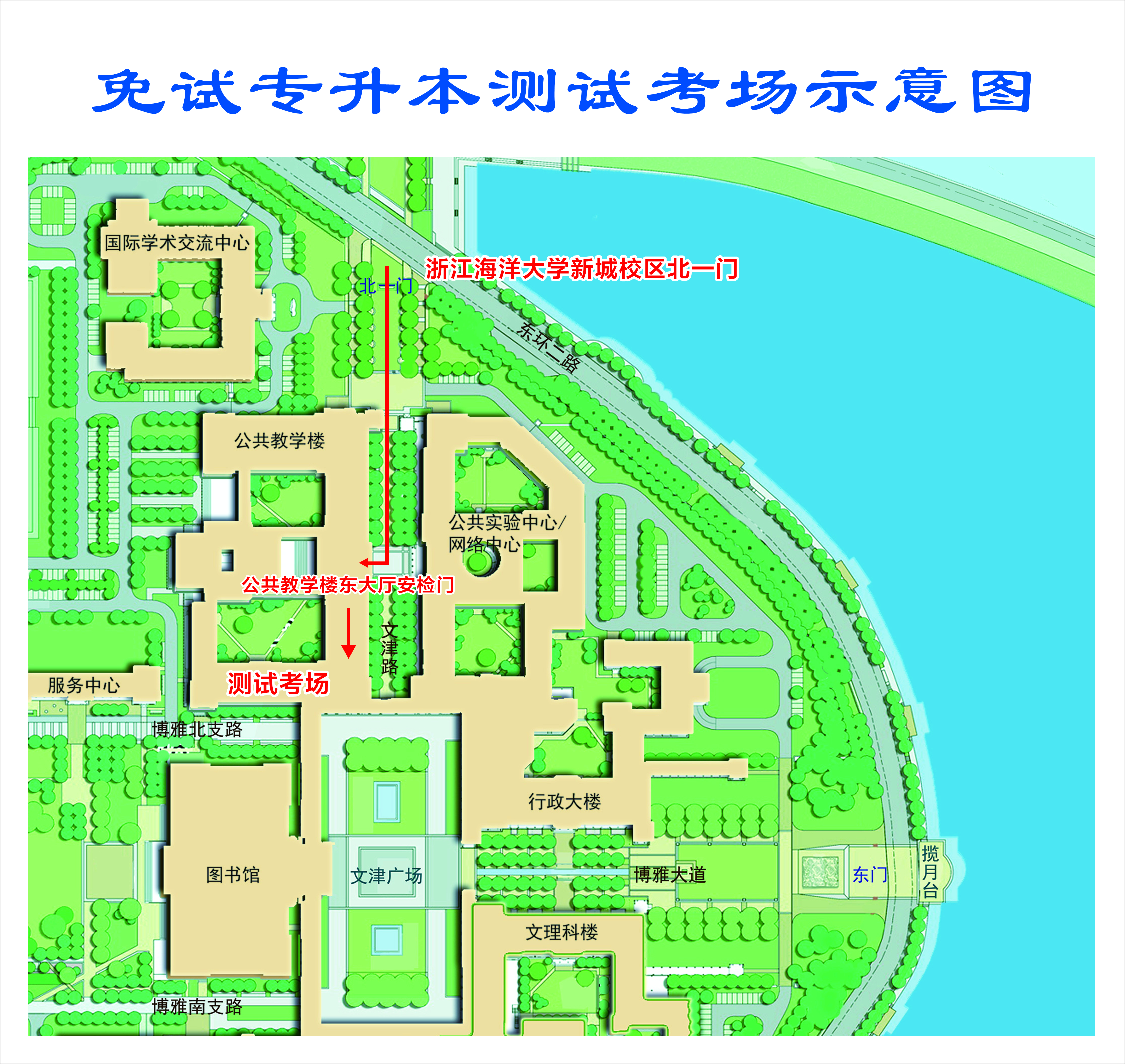2.自驾车来校考生,在学校新城校区北一门下车,车辆不进校。测试当天车辆较多,请服从现场工作人员指挥,做到文明停车。测试结束后,考生从学校北一门出校。