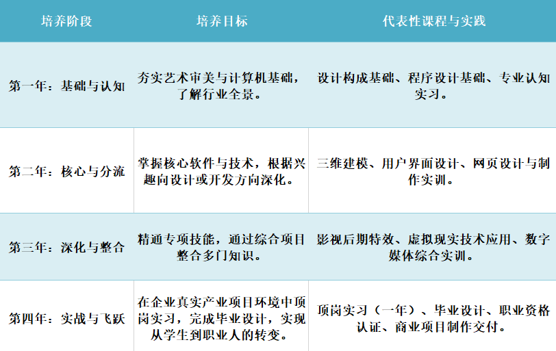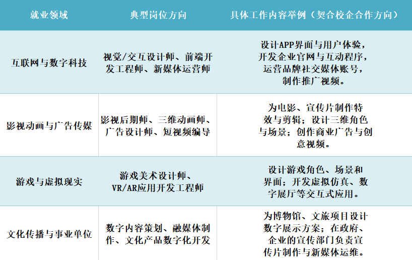 本专业毕业生可成长为技术与艺术兼备的复合型人才,就业领域广、岗位选择多。既可入职优质市场企业,也可报考相关专业研究生深造,还能竞聘公务员、事业单位数字化管理、文娱宣传等岗位,实现就业升学双向发展。