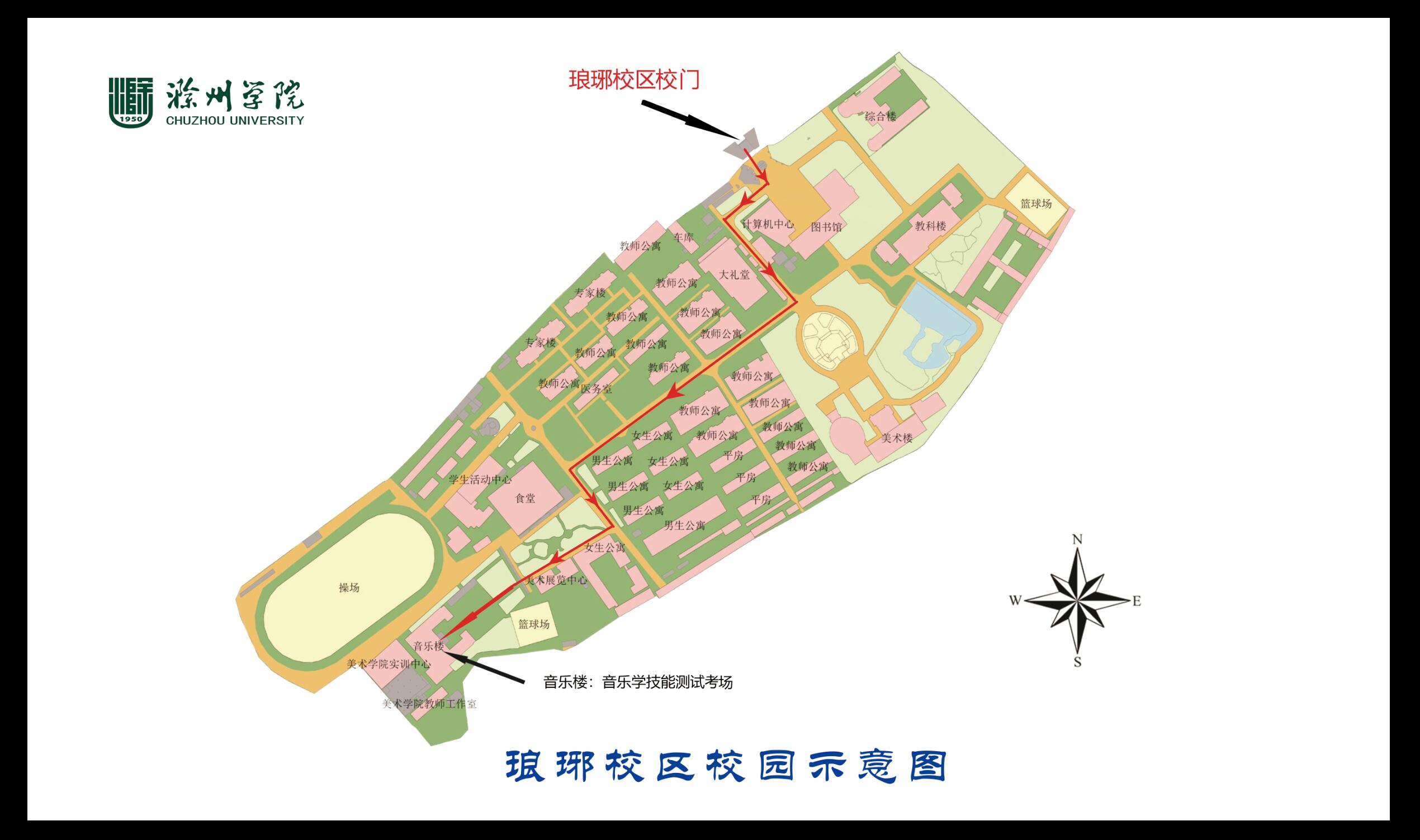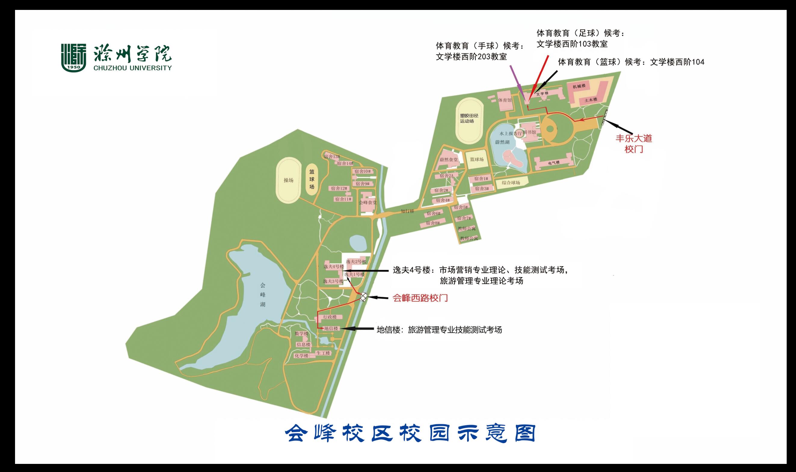 3.现公布我校会峰校区、琅琊校区校园示意图(见附件1、附件2),旅游管理专业考生参加技能测试须从会峰校区的会峰西路校门进校,体育教育专业考生参加技能测试须从会峰校区的丰乐大道校门进校,音乐学专业考生参加技能测试须从琅琊校区校门进校。