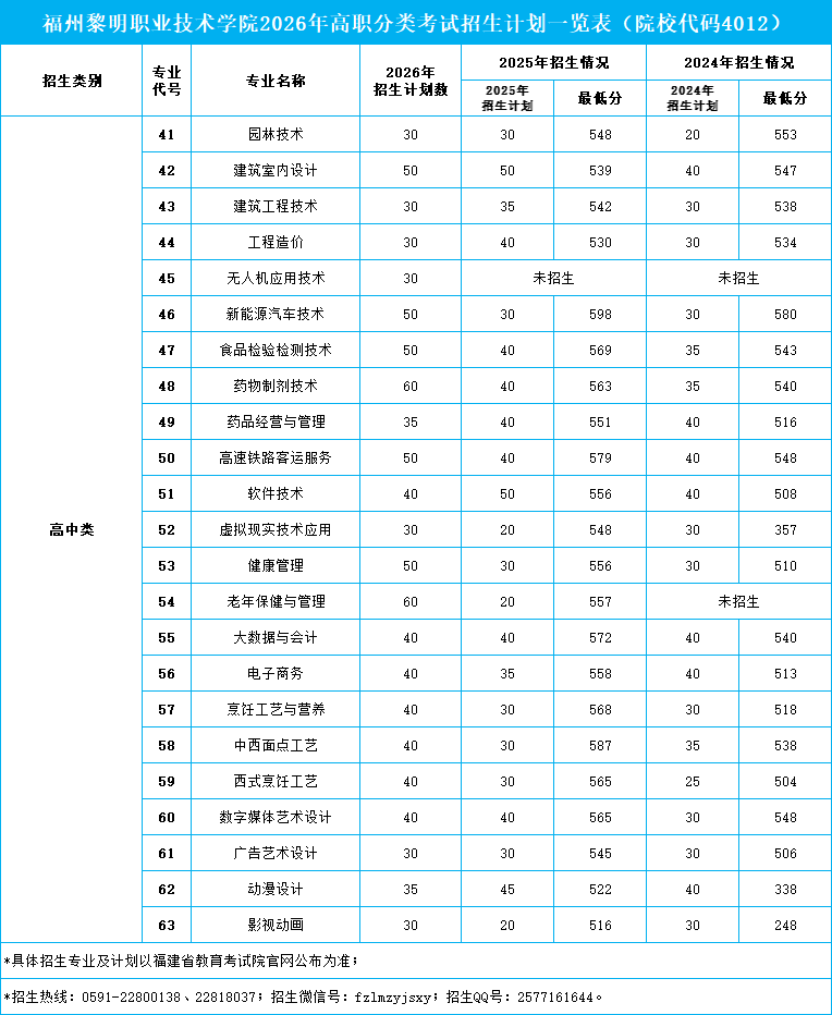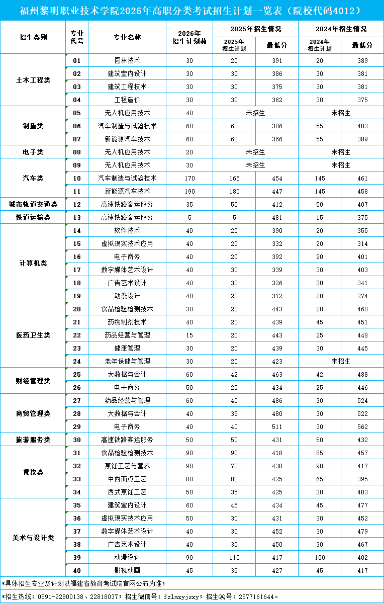 福州黎明职业技术学院2026年高职分类考试招生计划一览表(院校代码4012)