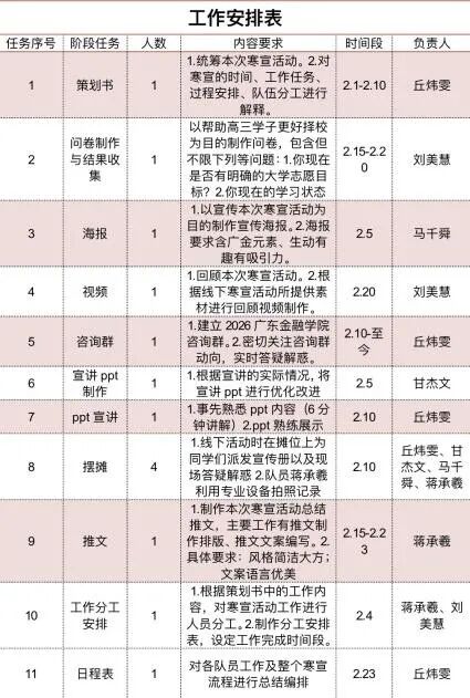 分阶段开展宣讲,先参与母校培训大会,掌握高三选科、分数段及专业需求;再开展线下摆摊,分工负责答疑、发资料、摄影;最后对接班主任,进班开展PPT宣讲与互动问答,深入讲解广金优势与备考经验。