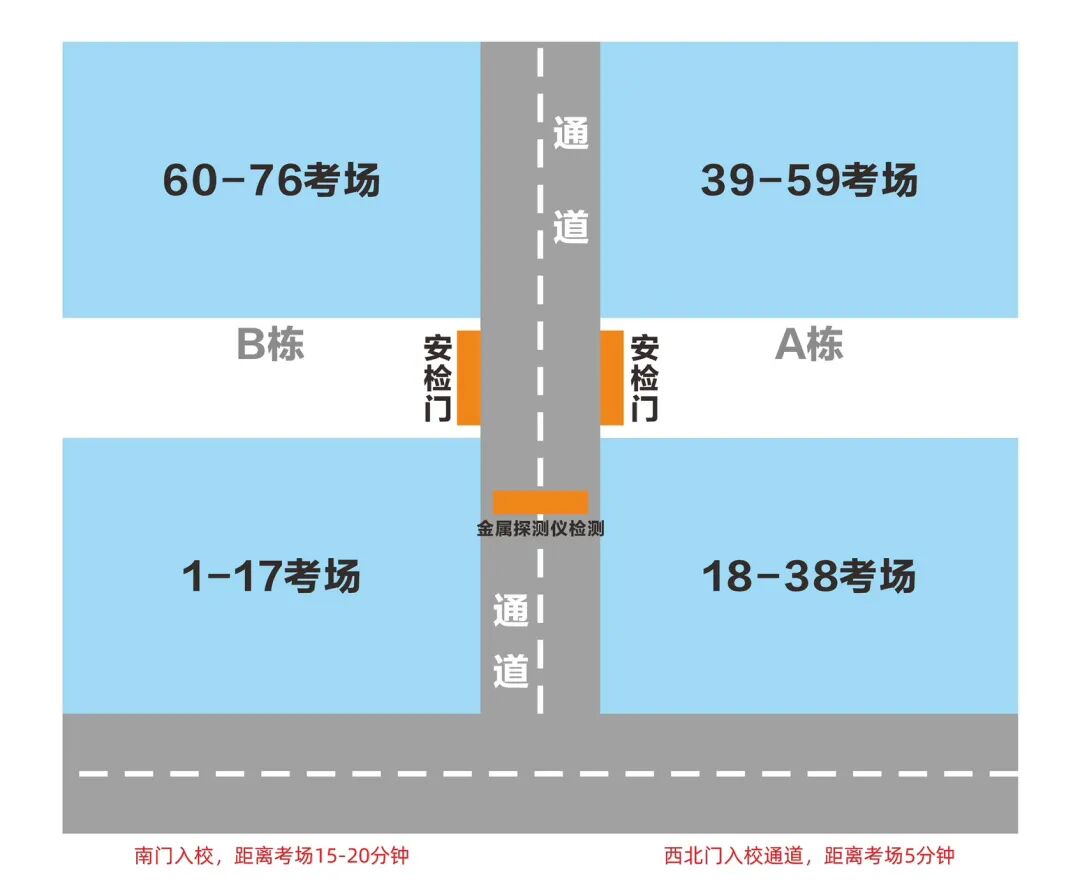 考试当天,我校于考前90分钟起开通西北门、南门作为考生入校通道,请考生入校后按路标(或志愿者)指引到达考场封闭区位置。学校平面图如下所示: