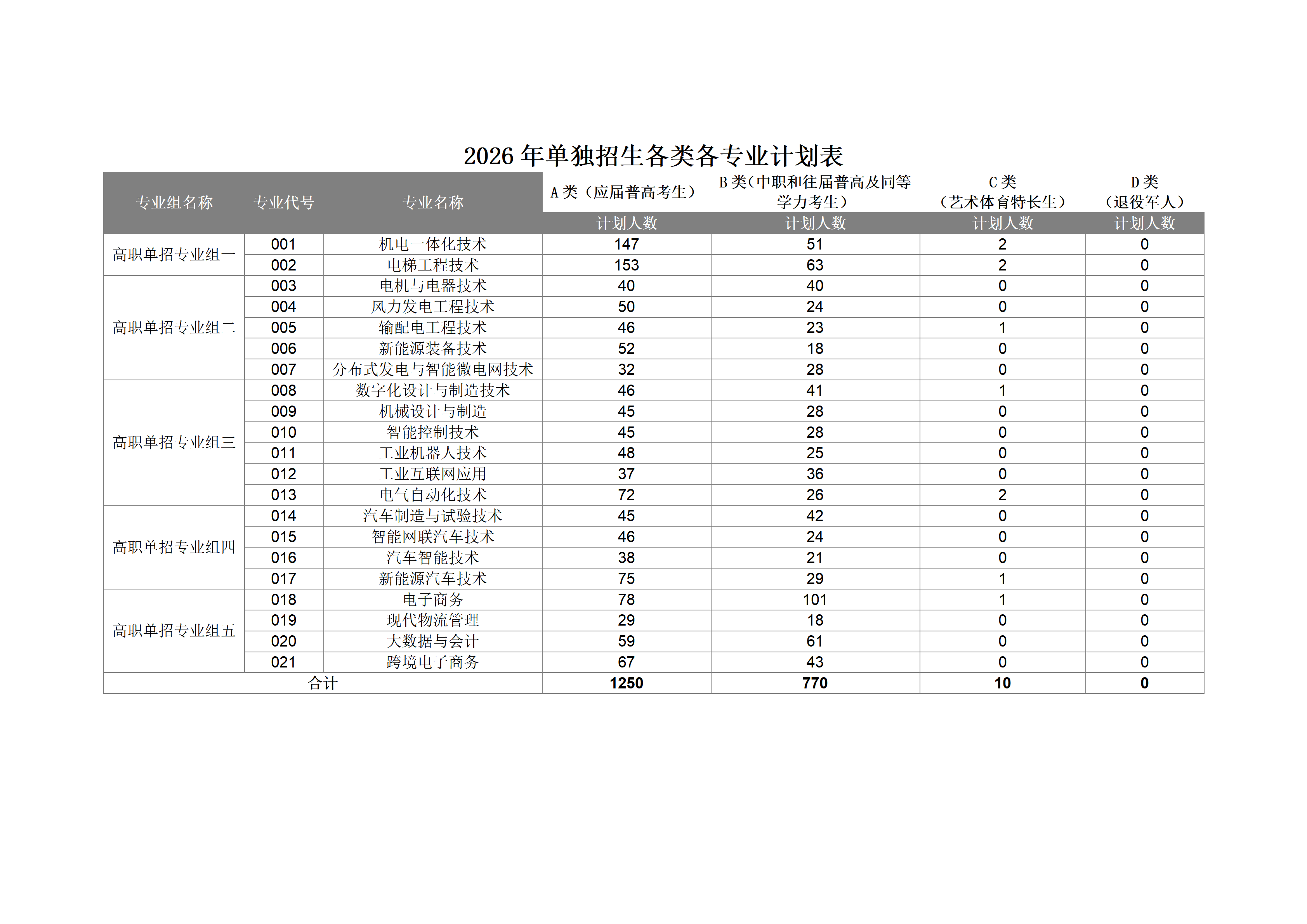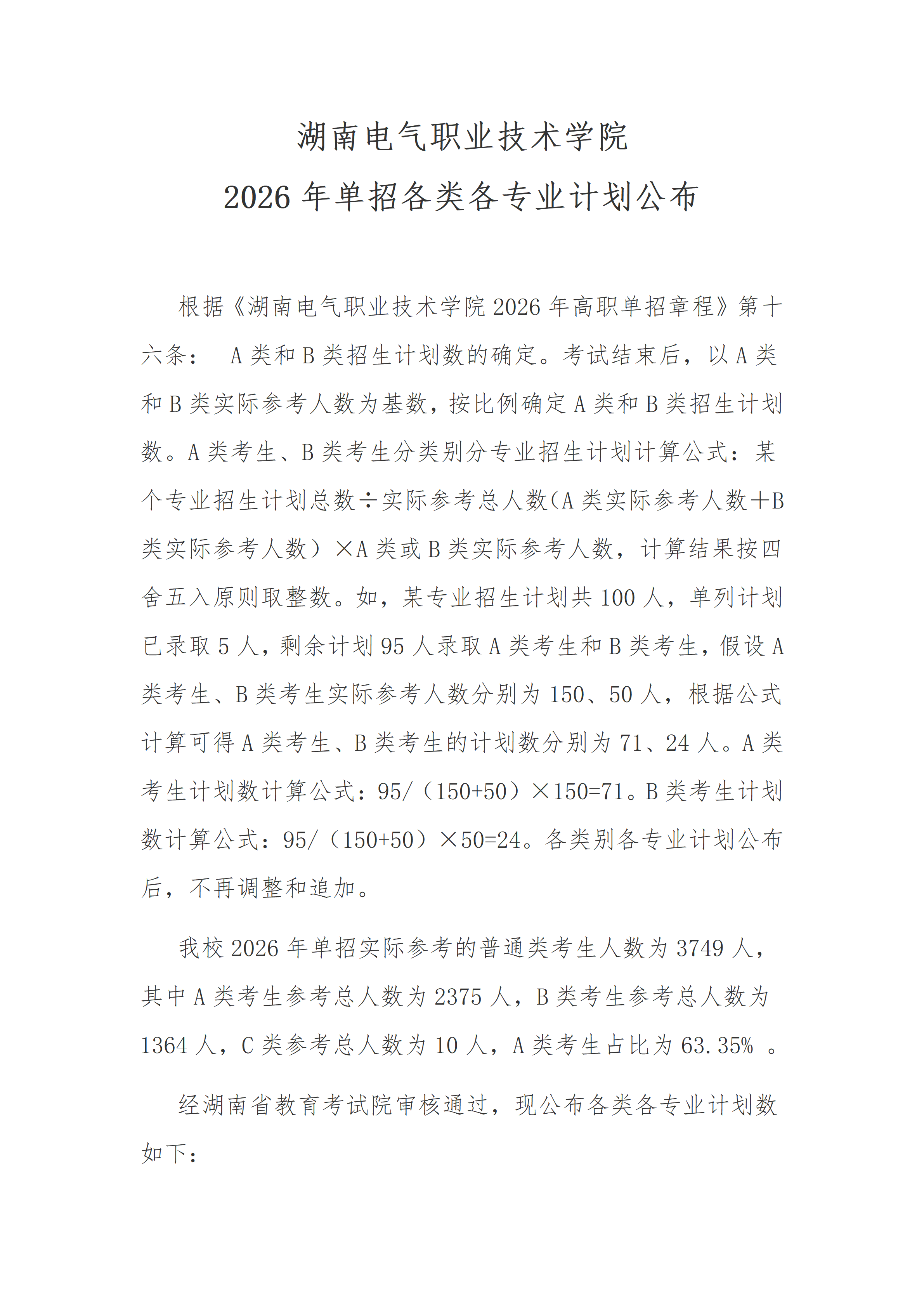 湖南电气职业技术学院2026年单招各类各专业计划公布