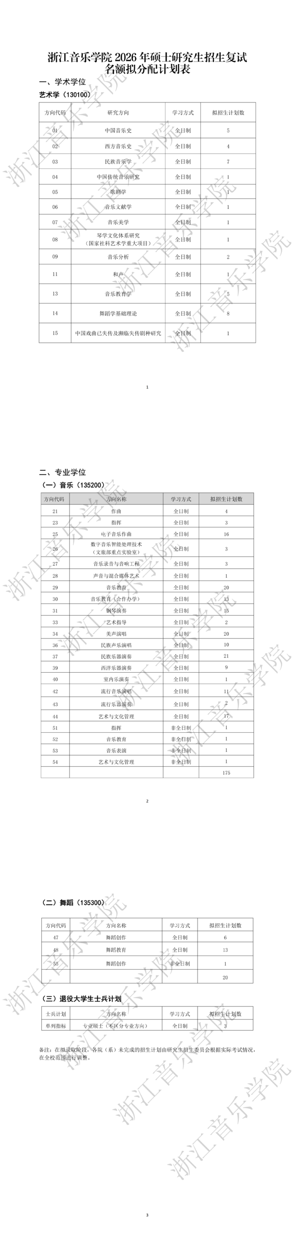 浙江音乐学院2026年硕士研究生招生复试名额拟分配计划表