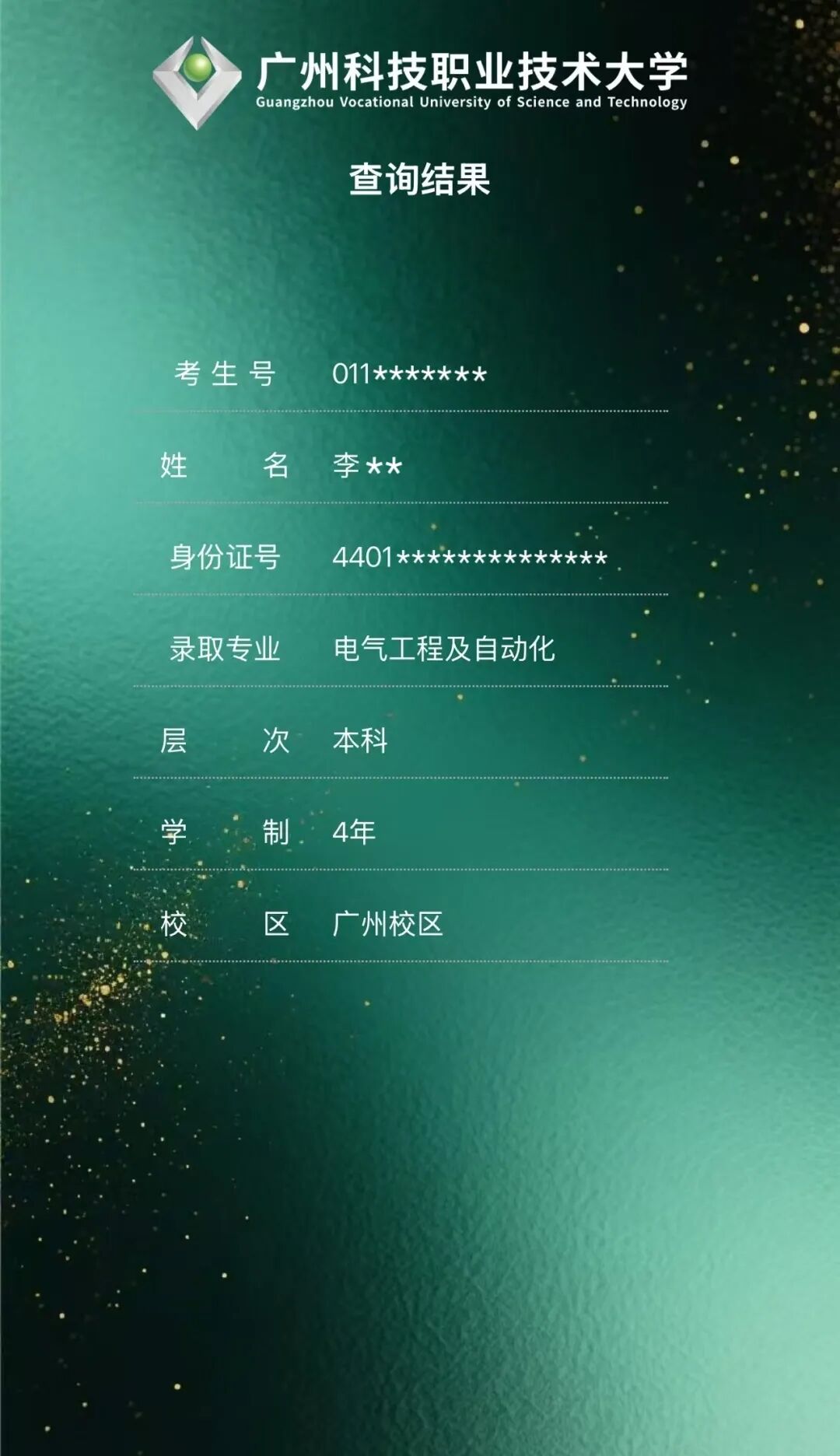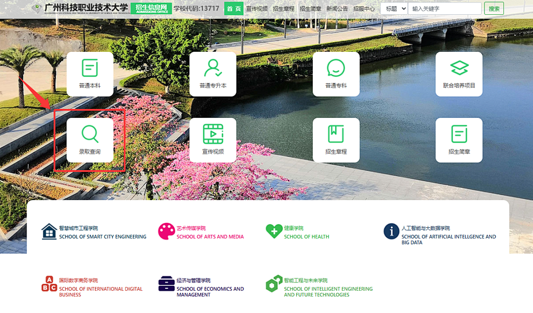 登录【广州科技职业技术大学招生信息网】,点击【录取查询】。