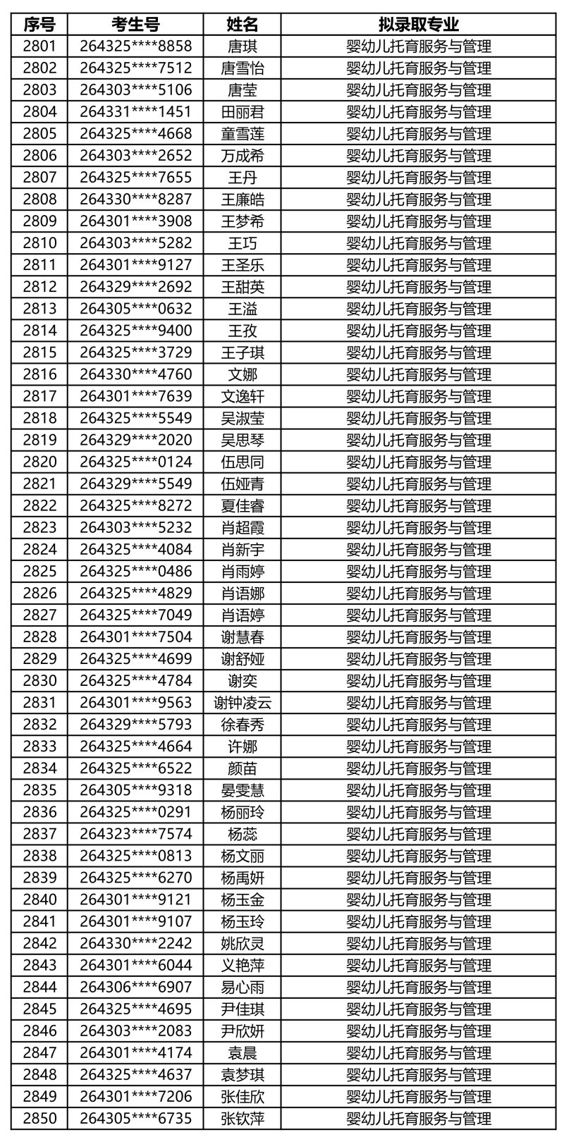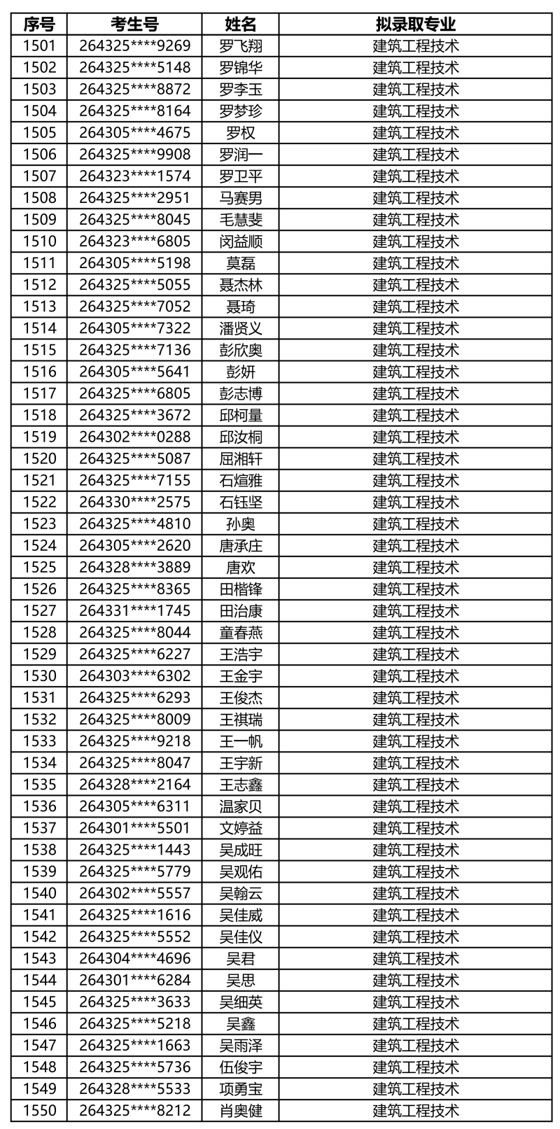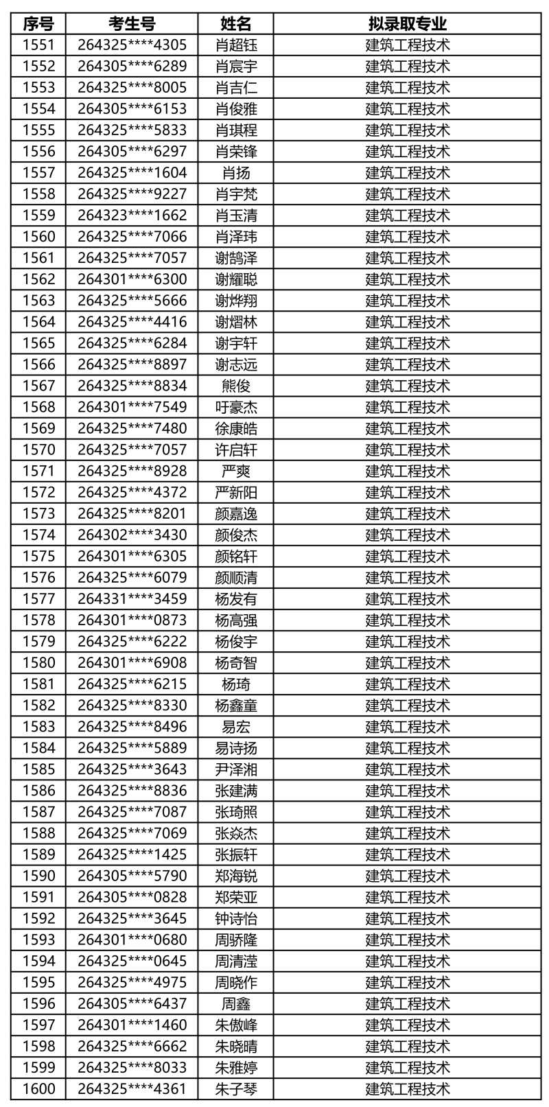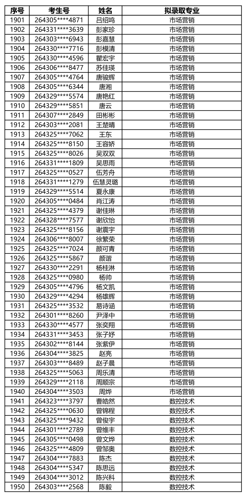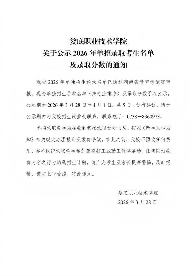 娄底职业技术学院2026年单独招生拟录取名单