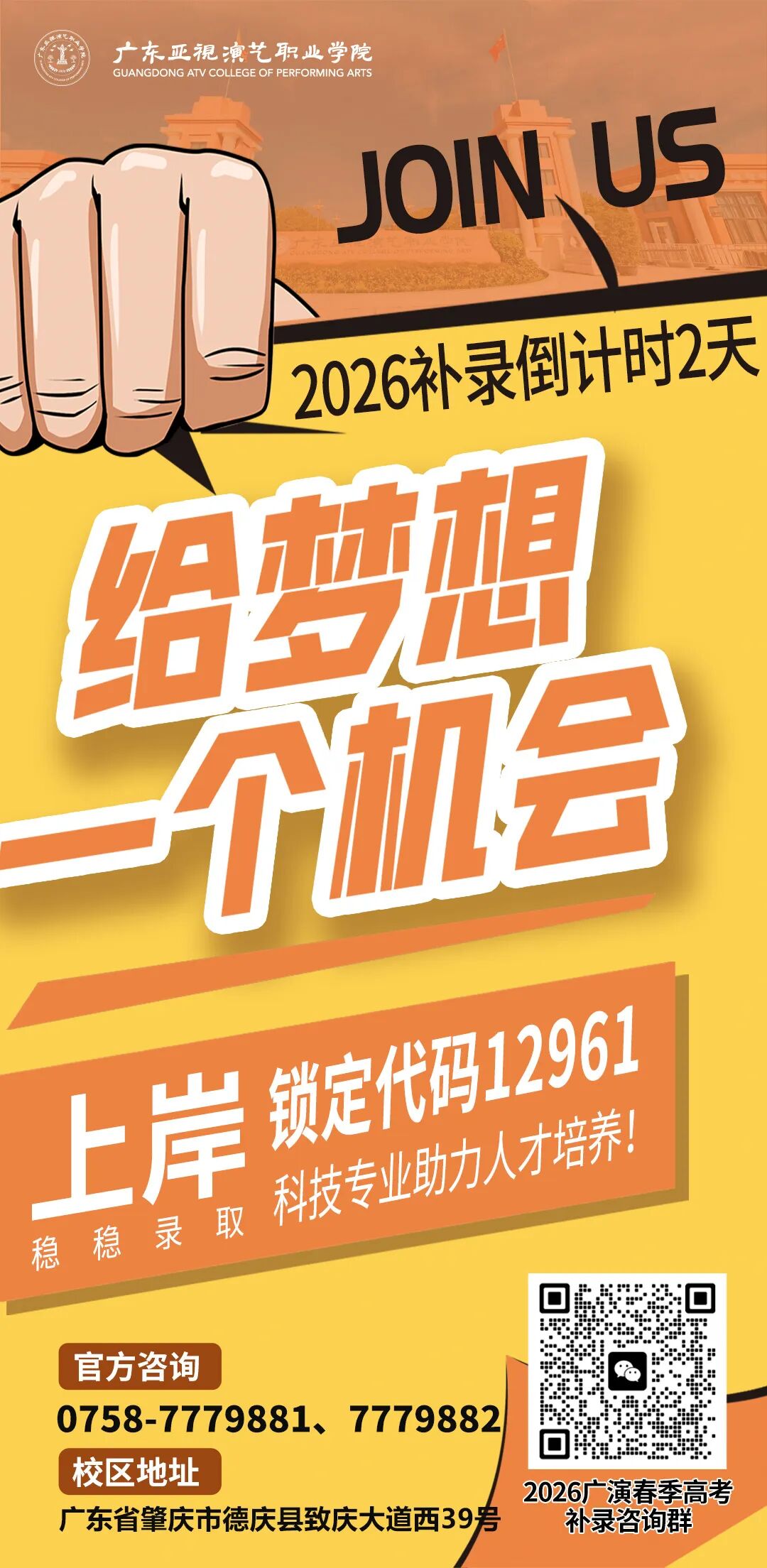 今天,广东亚视演艺职业学院给你吃一颗定心丸:我校2026年春季高考补录1500余个补录计划,十分充足!凡学考过征集志愿最低投档线的考生,第一志愿填报我校,稳上岸无压力,彻底告别滑档焦虑,轻松圆你大学梦!