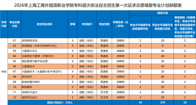 2026年上海工商外国语职业学院自主招生批次第一次征求志愿开启,本次预计征求志愿338名,其中成绩齐全的高中生征求计划为30人,成绩齐全的三校生278 人,其他类别学生30人,招生专业含普通类和艺术类共计12个。