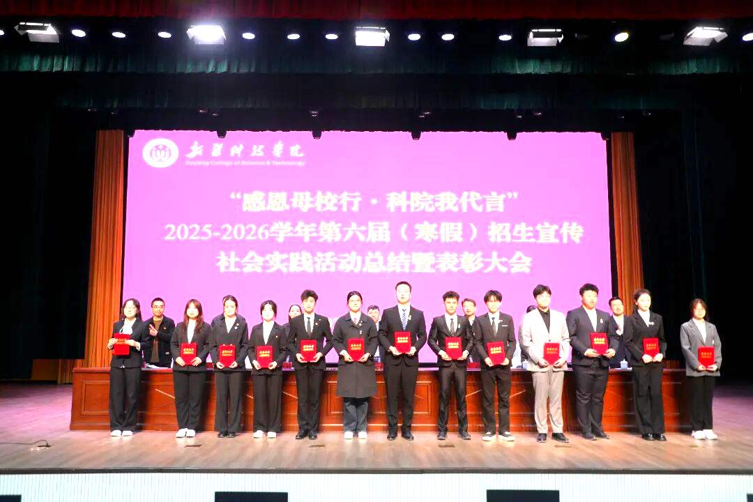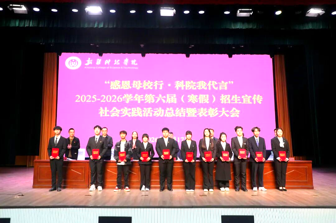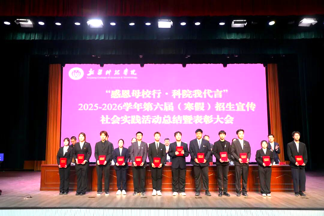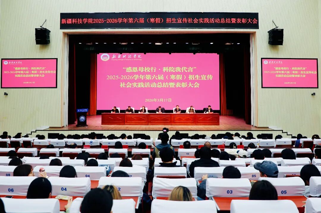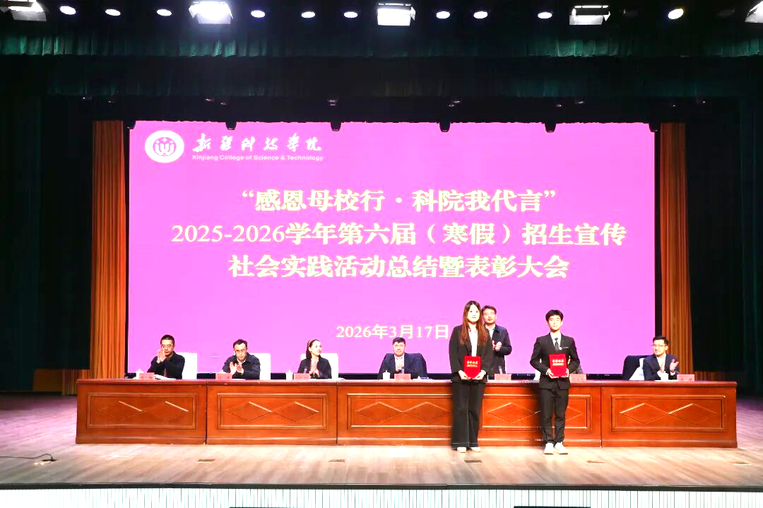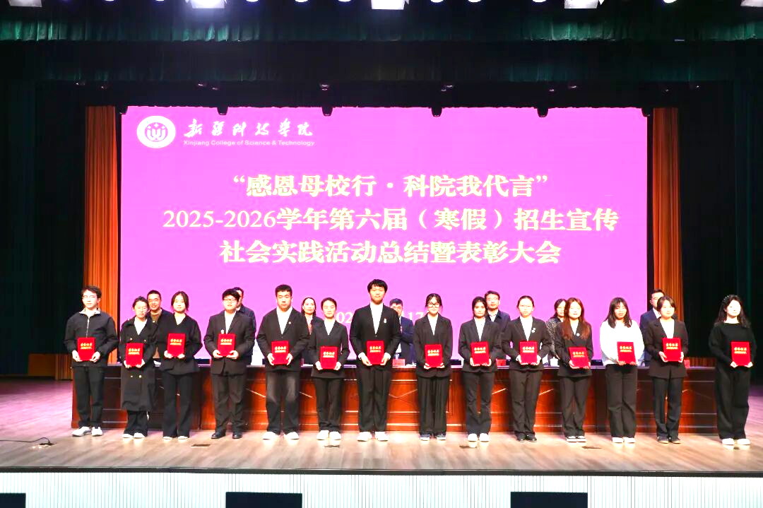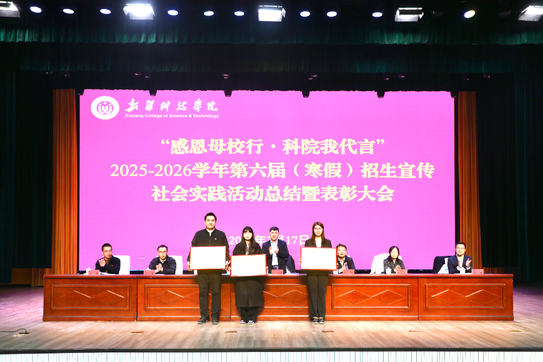 为总结招生宣传社会实践活动成效,表彰先进典型,凝聚招生工作合力,推动学校招生工作再上新台阶,近日,新疆科技学院2025-2026学年第六届(寒假)招生宣传社会实践活动总结暨表彰大会在鸿雁校区大礼堂举行。校党委常委、副院长那苏如拉・阿不都热西提出席会议并讲话,党委学工部副部长拜尔娜・木沙主持会议。