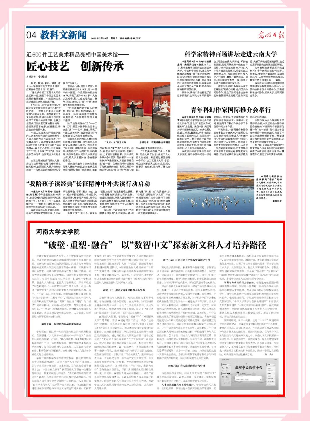 3月29日,《光明日报》刊发了题为《河南大学文学院:“破壁·重塑·融合” 以“数智中文”探索新文科人才培养路径》的文章,专题报道我校文学院新文科人才培养路径。