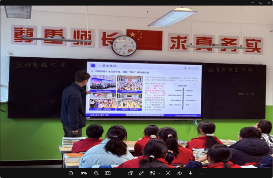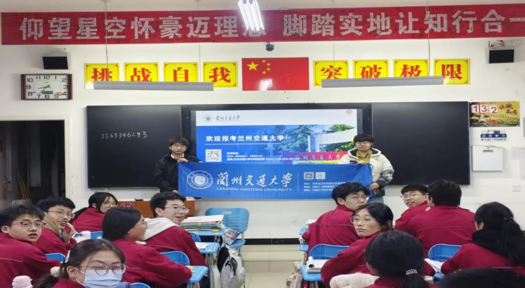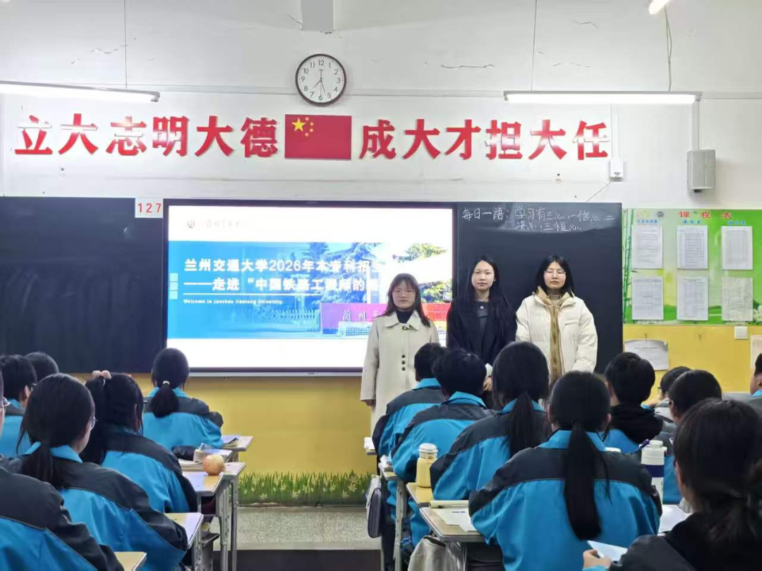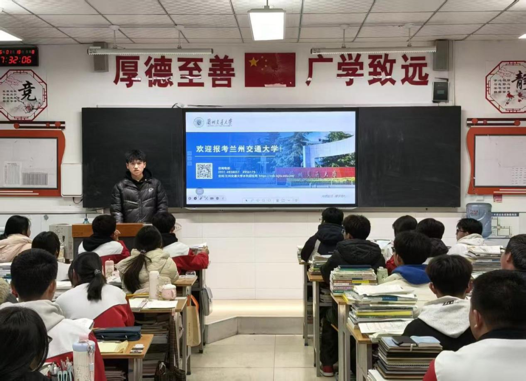 看着学弟学妹们青涩又坚定的脸庞,仿佛看到了当年为梦想埋头苦读的自己。曾经的我们,也在这间教室里奋笔疾书,在迷茫中寻找方向,在憧憬中期盼着远方的大学。而如今,我带着在兰州交通大学的收获与成长归来,将校园里严谨求实的学风、开拓创新的精神,以及铁路交通领域的使命与担当讲给他们听。我向大家介绍兰州交大的办学底蕴,分享在校园里的学习生活、实践经历,讲述一代代交大人坚守交通报国、传承铁道精神的故事,看着台下眼中闪光的他们,我真切感受到,青春的梦想正在被点燃,奋斗的力量正在被传递。