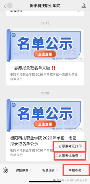 ①进入衡阳科技职业学院微信公众号,于底部菜单栏选择“单招考试”。在弹出子菜单中点击“二志愿考试缴费”或者“二志愿准考证打印”通道。