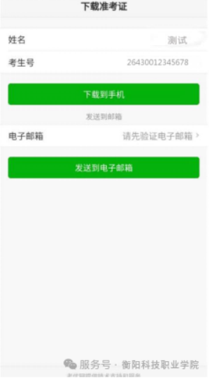 ⑤点击“下载准考证”按钮可以下载准考证,下载提供二种方式:下载到手机、发送到电子邮箱。