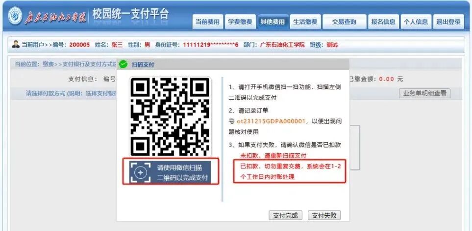 2.选择缴费方式后,使用手机微信扫码二维码后,请认真核对收款方名称,收款方为广东石油化工学院。