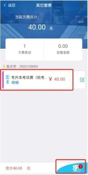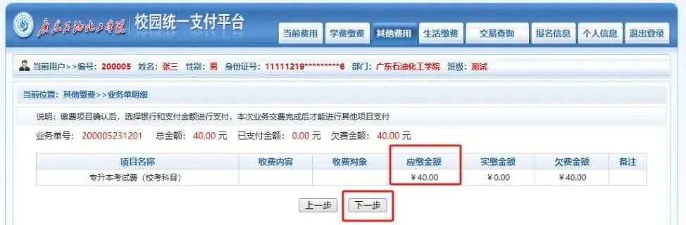 第四步:登录系统后,点击“其他费用”,确认项目“专升本考试费”和应缴金额,点击“下一步”。