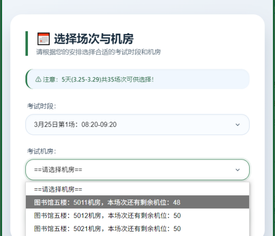 (二)考生自行选择考试时段(场次)与考试机房,如果本时段(场次)所有机房机位剩余数为0,请更换其他考试时段(场次)后再次选择机房。