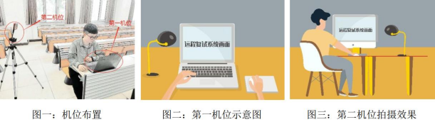 第二台机为辅助设备,机位采集考生第一台设备显示器及考生坐姿全身和所处环境的整体情况,放置于考生右后方45度位置,使复试小组能清晰查看第一机位屏幕以及考生所处复试环境,需可自由移动,考试过程中考生需根据考官指令随时变换机位位置。机位布置整体效果如图一、二、三所示。