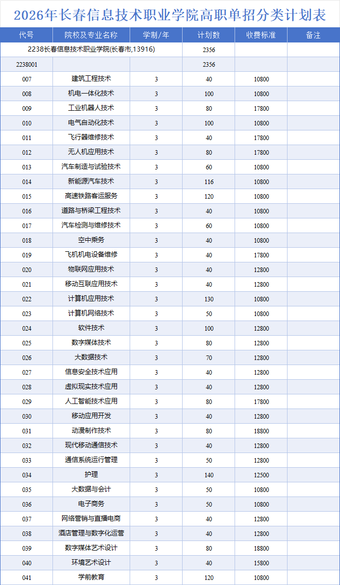 2026年长春信息技术职业学院高职单招分类计划表