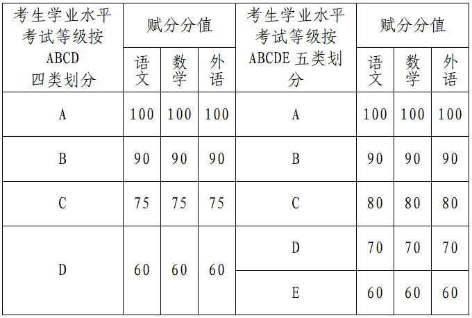 文化素质考试采用高中学业水平考试中语文、数学、外语3门科目成绩,不另行组考,具体赋分办法如下: