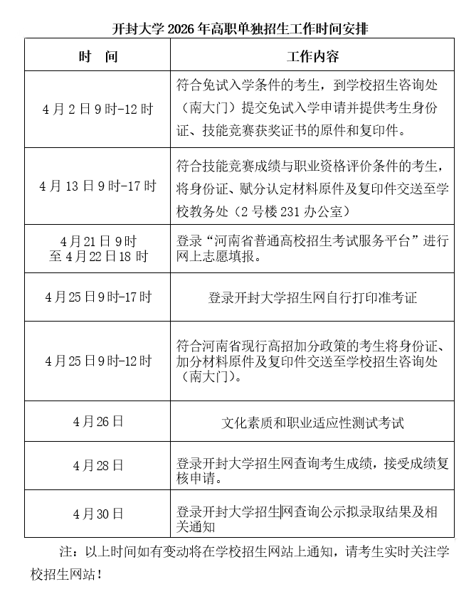1. 开封大学未委托任何中介机构或个人进行招生录取工作,高职单招考试不收取任何费用,对以学校名义进行非法招生等活动的中介机构或个人,学校将依法追究其责任。望考生和家长不要轻信任何中介机构或个人的非法招生诈骗行为。