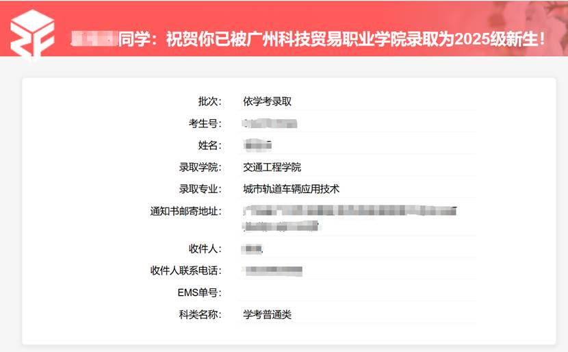 方式二:微信搜索 “广州科技贸易职业学院招生办”公众号--招生资讯--录取查询。