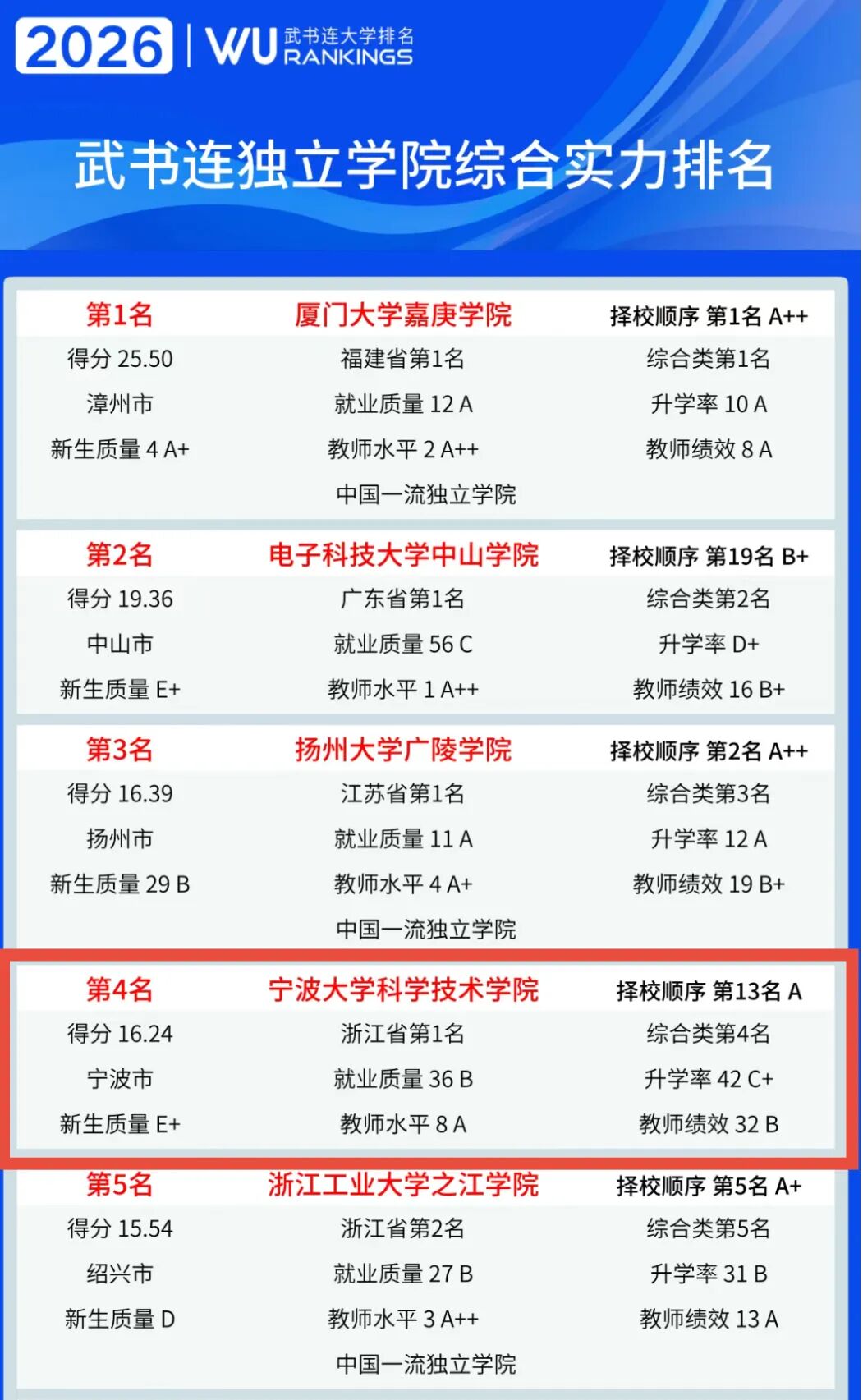 4月1日,武书连2026中国民办大学独立学院排名榜正式发布。宁波大学科学技术学院在独立学院综合实力排名中位列全国第四、浙江省第一!这是我校首次荣登该榜单浙江省榜首,也是继斩获校友会2026中国独立学院全国第三、浙江省第一后,学校办学综合实力再获权威认可的有力见证。