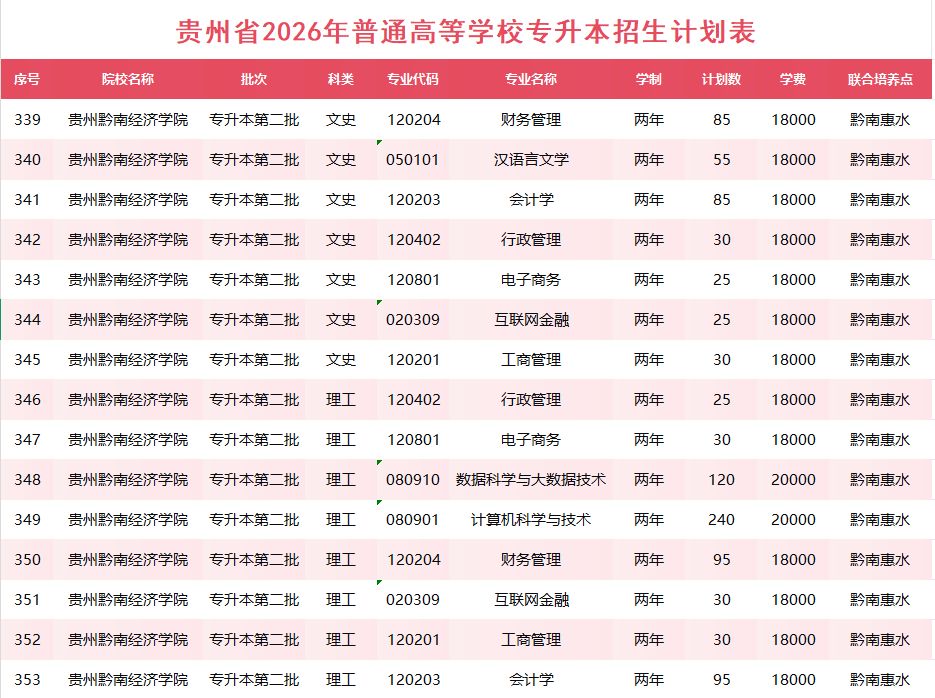 根据《贵州省招生考试院关于公布贵州省2026年专升本招生计划的通告》,贵州黔南经济学院2026年“专升本”招生9个专业,计划共1000人