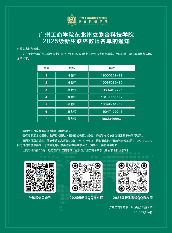 广州工商学院东北州立联合科技学院2025级新生联络教师名单的通知