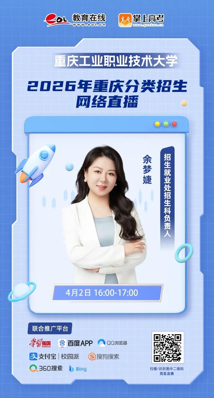 为帮考生与家长全面了解招生政策、精准填报志愿,重庆工业职业技术大学特举办2026 年高职分类考试招生网络直播咨询会,权威解读、在线答疑,一站式解决报考疑问!