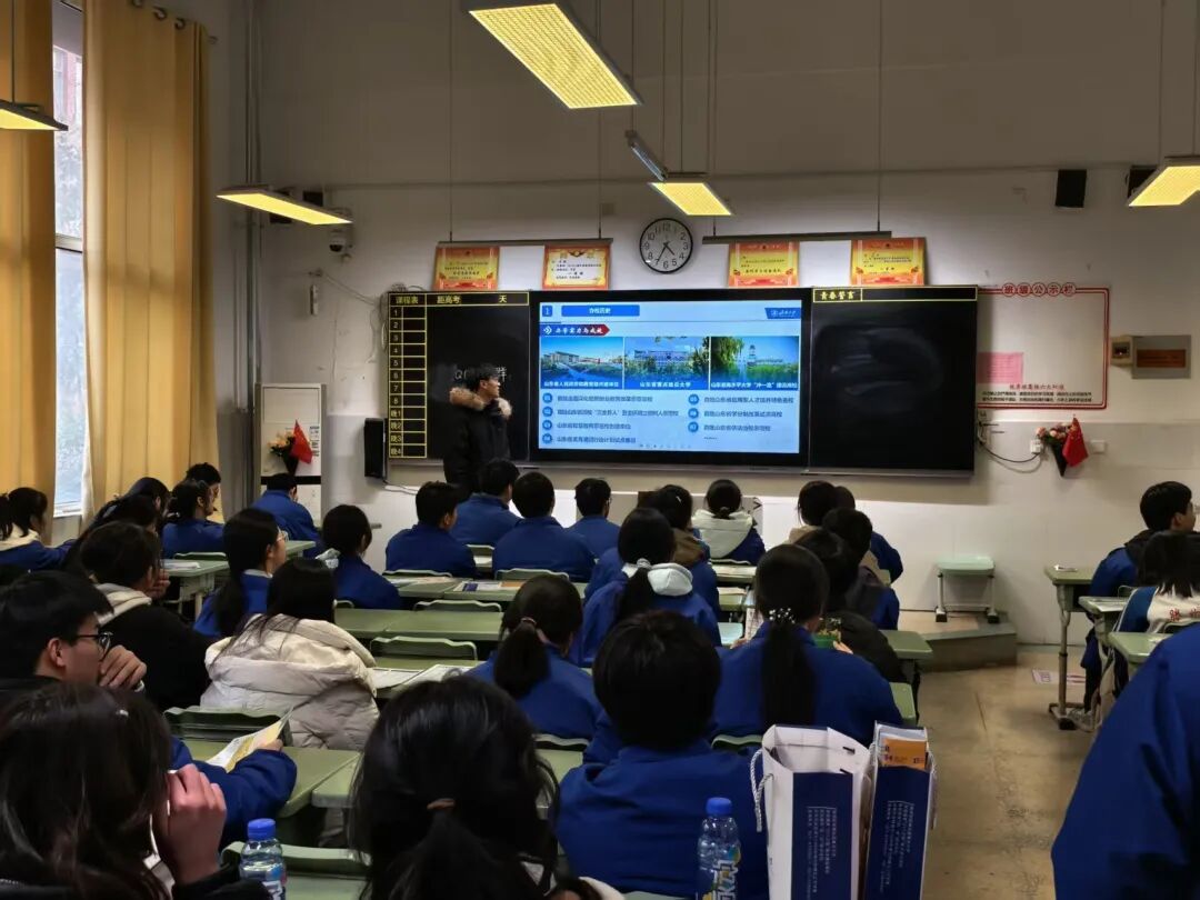 面向高一、高三年级开展入班专项宣讲,围绕济大人才培养特色、区位优势、招生录取政策及2026年招生要求及优势学科录取分数线等内容进行系统解读,并组织观看《涌泉》宣传片,为学弟学妹们分发济大专属文创礼品。宣讲既有助于高一学子提前树立升学规划意识,也能够为高三提振备考信心、鼓舞冲刺斗志。现场多名同学主动咨询专业录取标准与就业发展前景,有效提升了济南大学在高中母校师生中的认知度与影响力,活动成果得到高中母校师生的高度认可与一致好评。