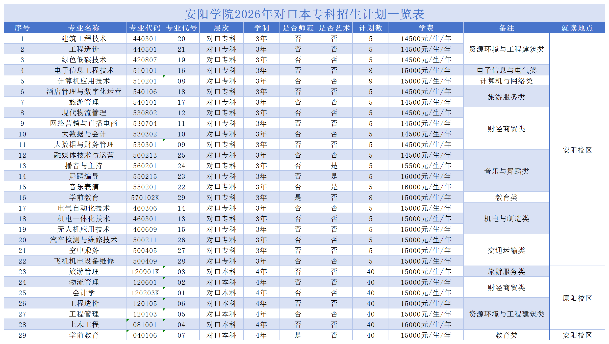 安阳学院2026年对口本专科招生计划一览表