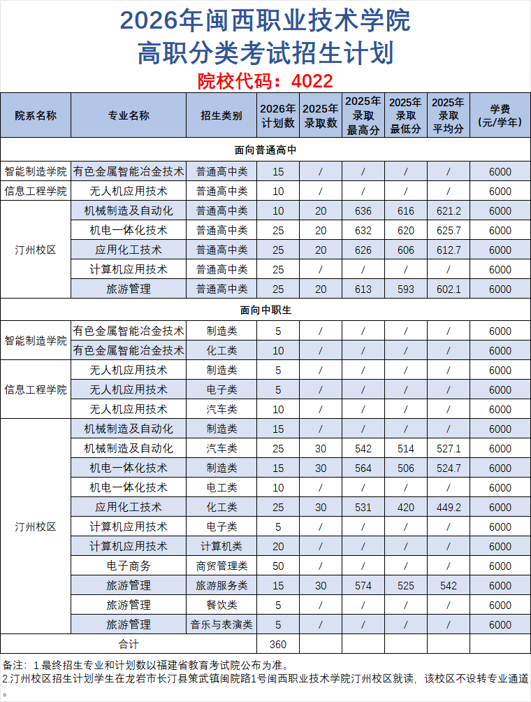 2026年闽西职业技术学院高职分类考试招生计划表