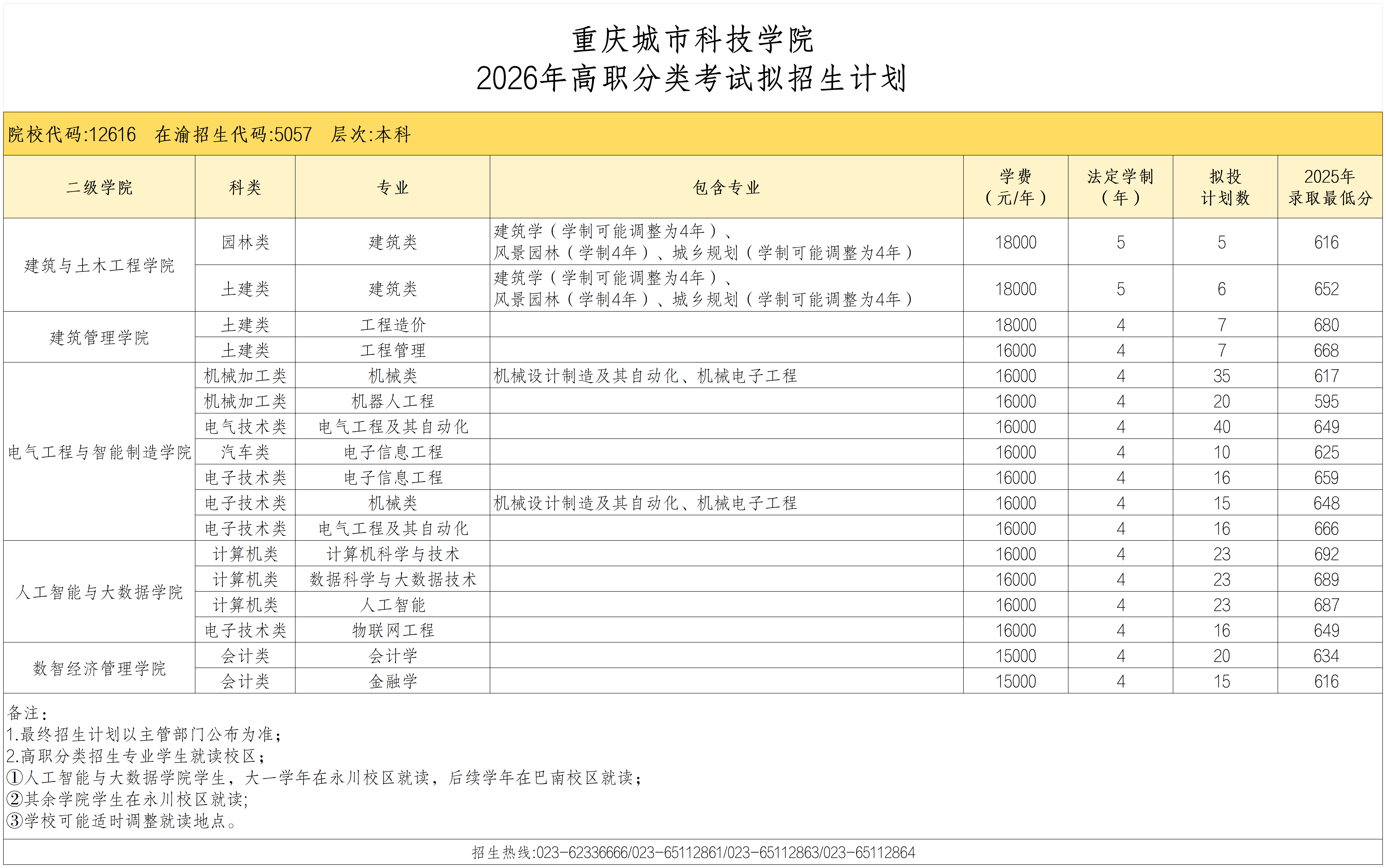 重庆城市科技学院2026年高职分类考试拟招生计划(点击查看高清大图)