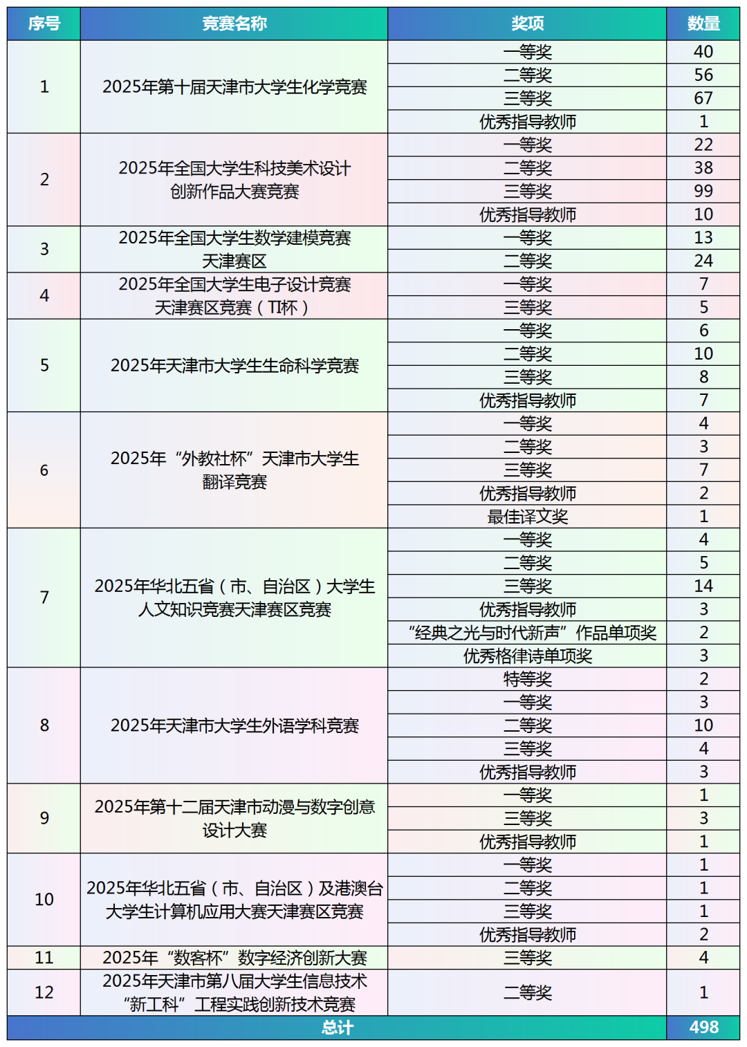 获奖数量的跃升,既是学子们勤奋努力的结果,更是学校人才培养质量持续提升的生动体现。近年来,教务处始终坚持“学生中心、产出导向、持续改进”的教育理念,将学科竞赛与课程体系、实践教学、创新创业教育深度融合,构建了“校级竞赛—市级竞赛—国家级竞赛”三级竞赛体系,形成了我校《本科生学科竞赛清单》,为学子搭建了多元化的成长平台。未来,学校将聚焦“以赛提质、以赛育优”核心目标,进一步深化教育教学改革,完善竞赛支持体系,助力学子在竞技中锤炼适应未来发展的核心能力,让学科竞赛成为赋能人才成长、提升办学质量的强劲动力。
