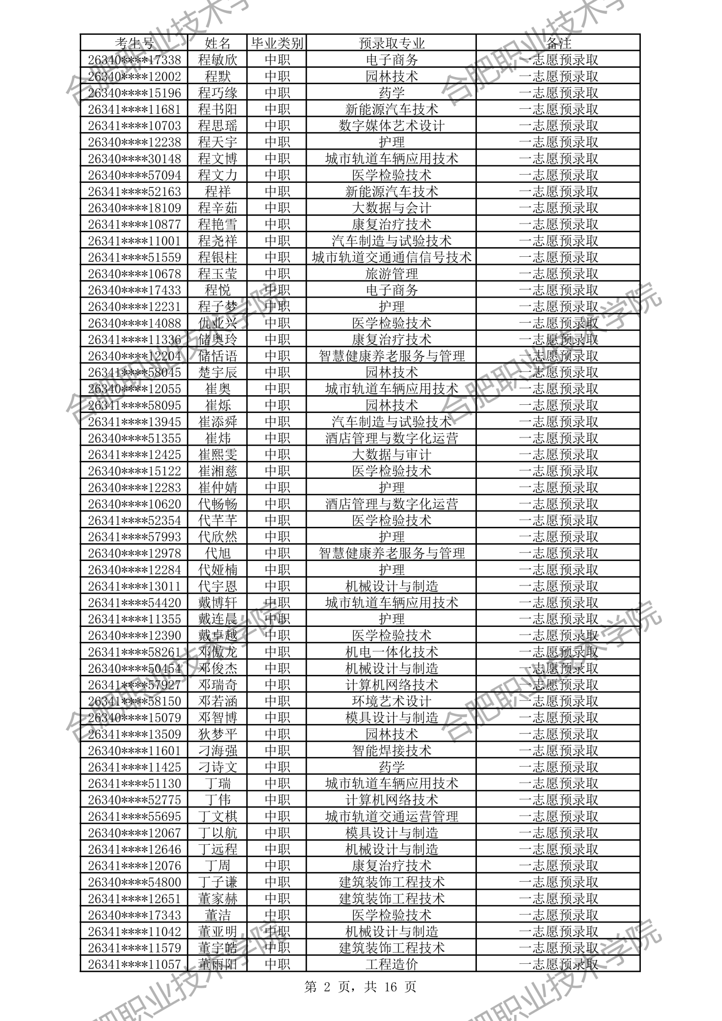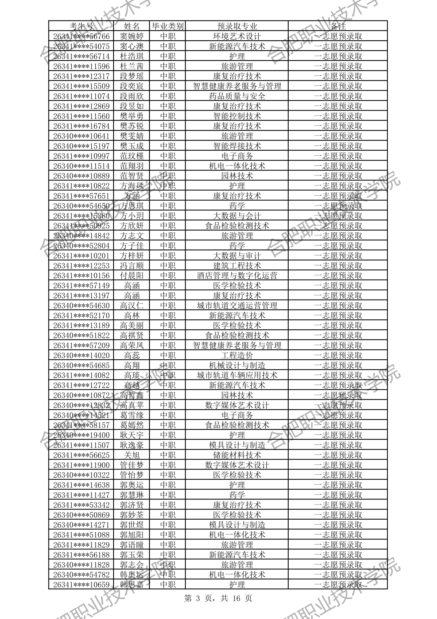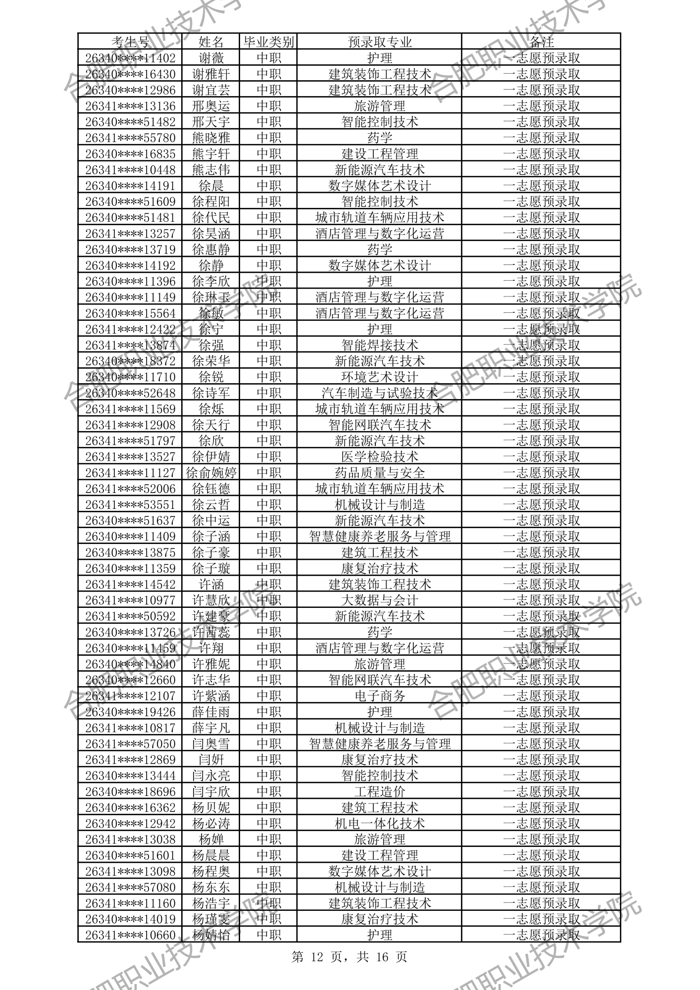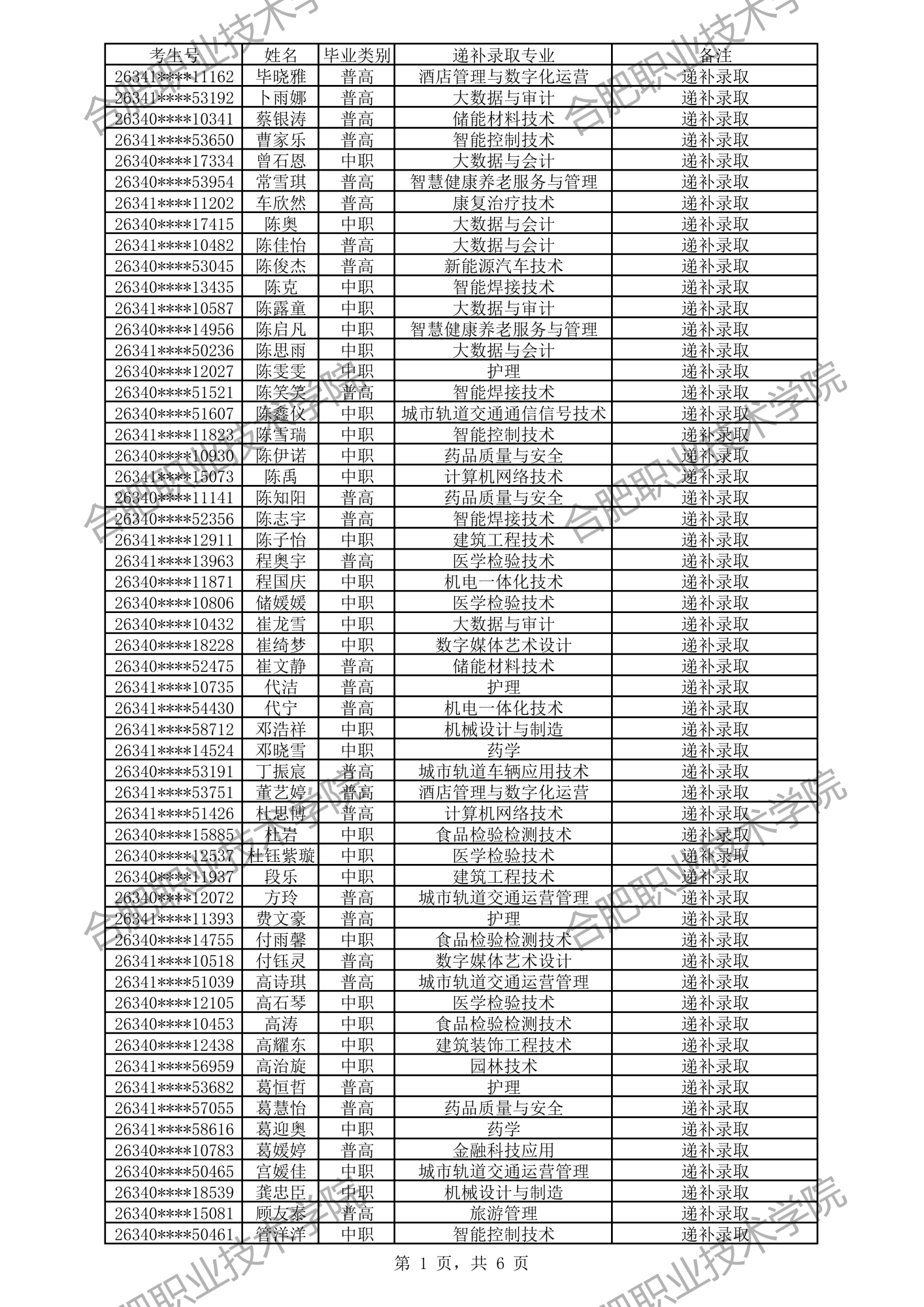 合肥职业技术学院2026年分类考试招生预录取及递补预录取名单公示