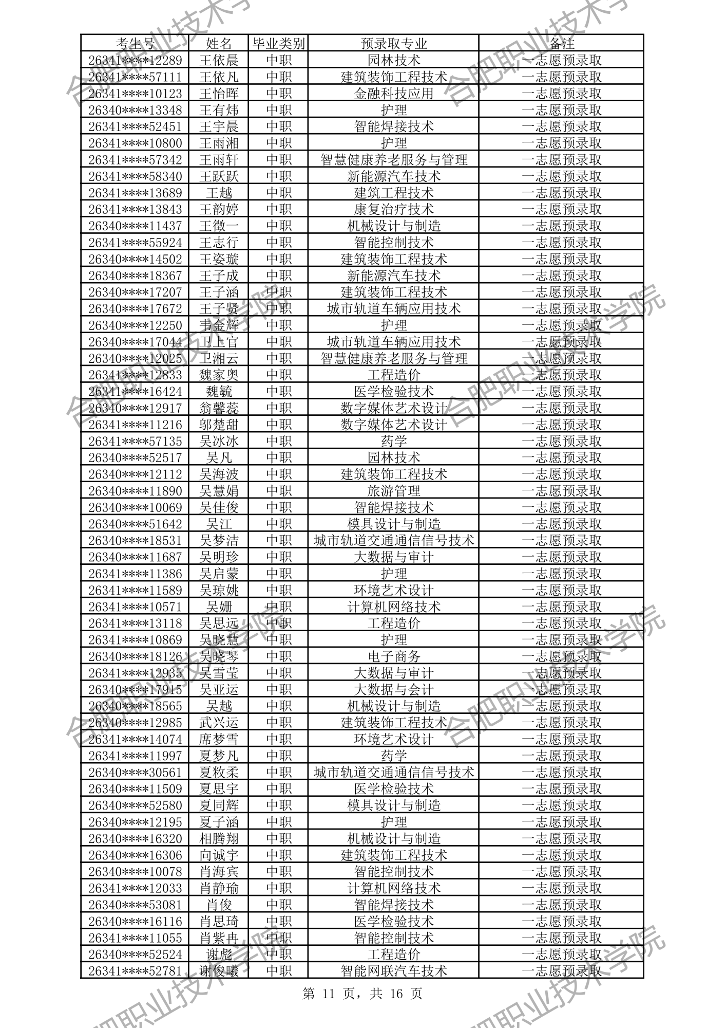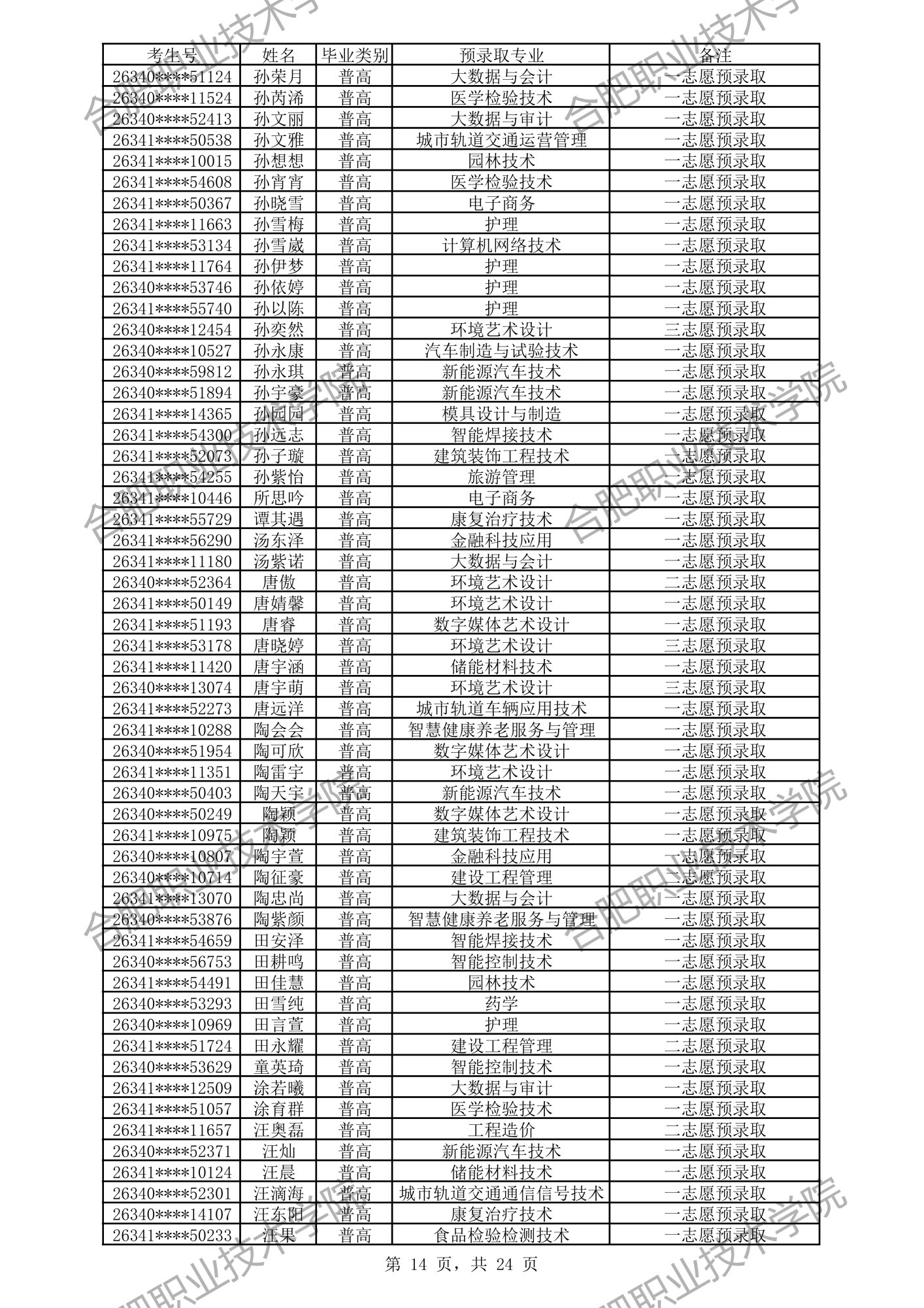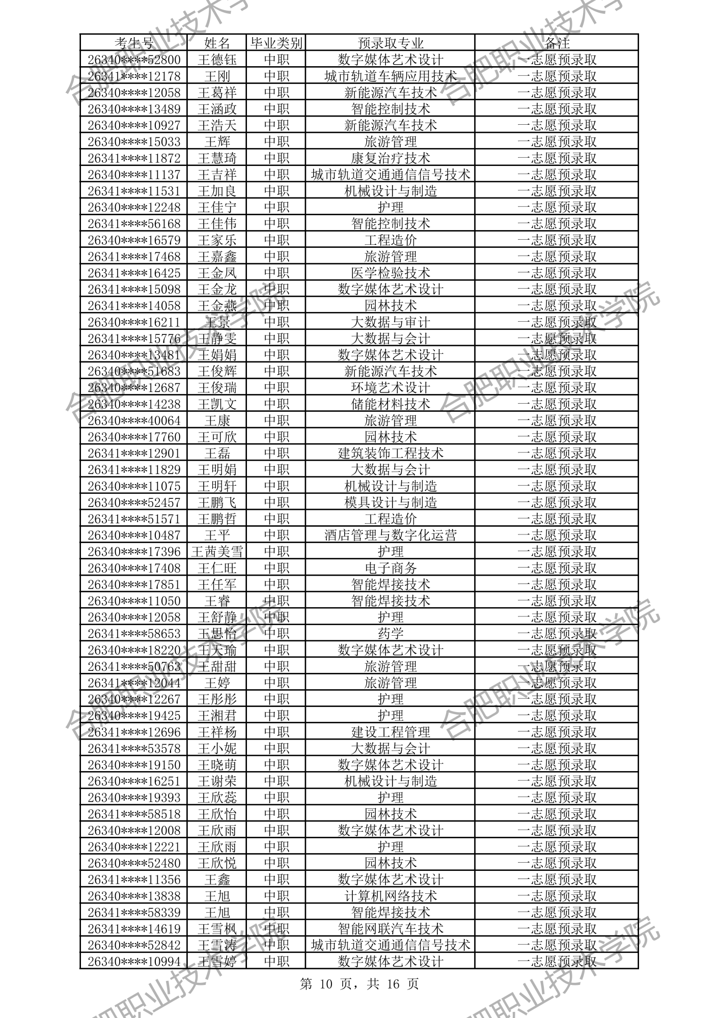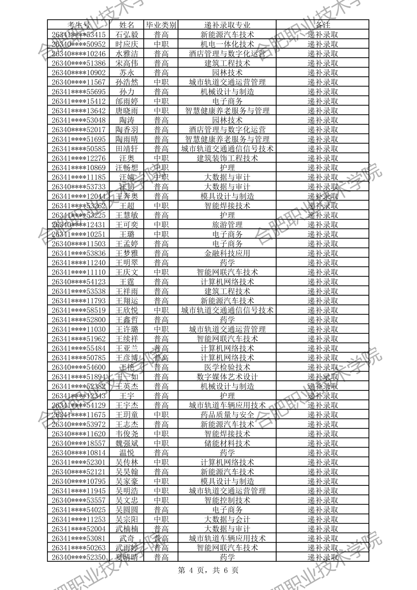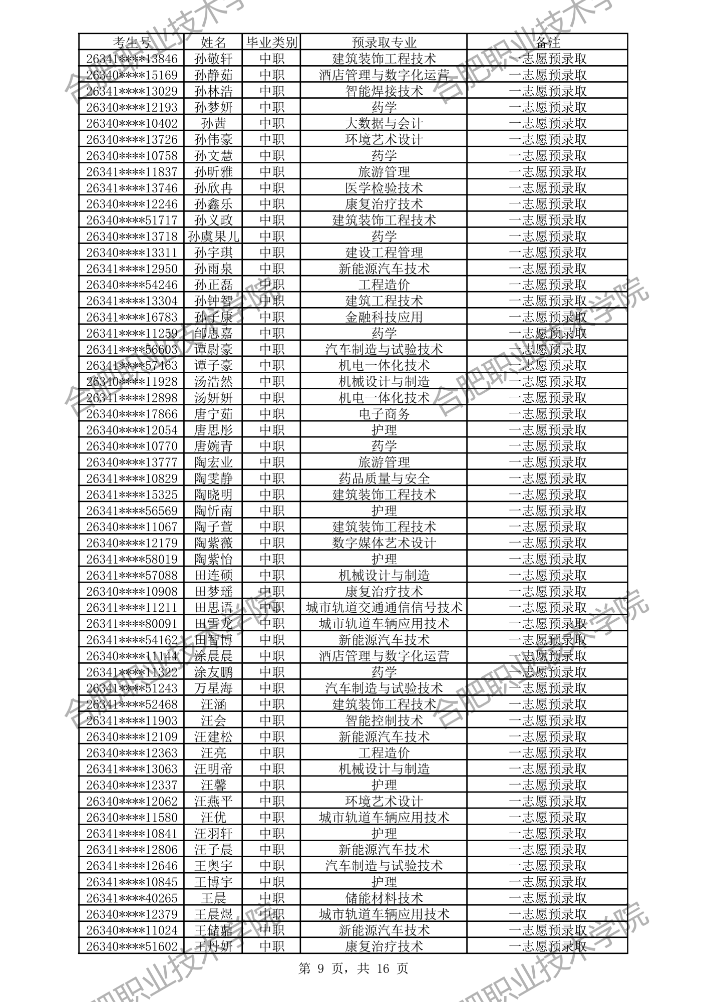 根据我校2026年分类考试招生章程有关规定,经过文化素质考试、职业适应性测试、职业技能考试,形成考生入学测试成绩(考生入学测试成绩 =文化素质测试成绩50%+职业适应性测试或职业技能考试成绩50%)。现将我校预录取及递补预录取名单公示如下,如有异议,请拨打电话0551-82364123,公示时间:4月3日-4月6日。
