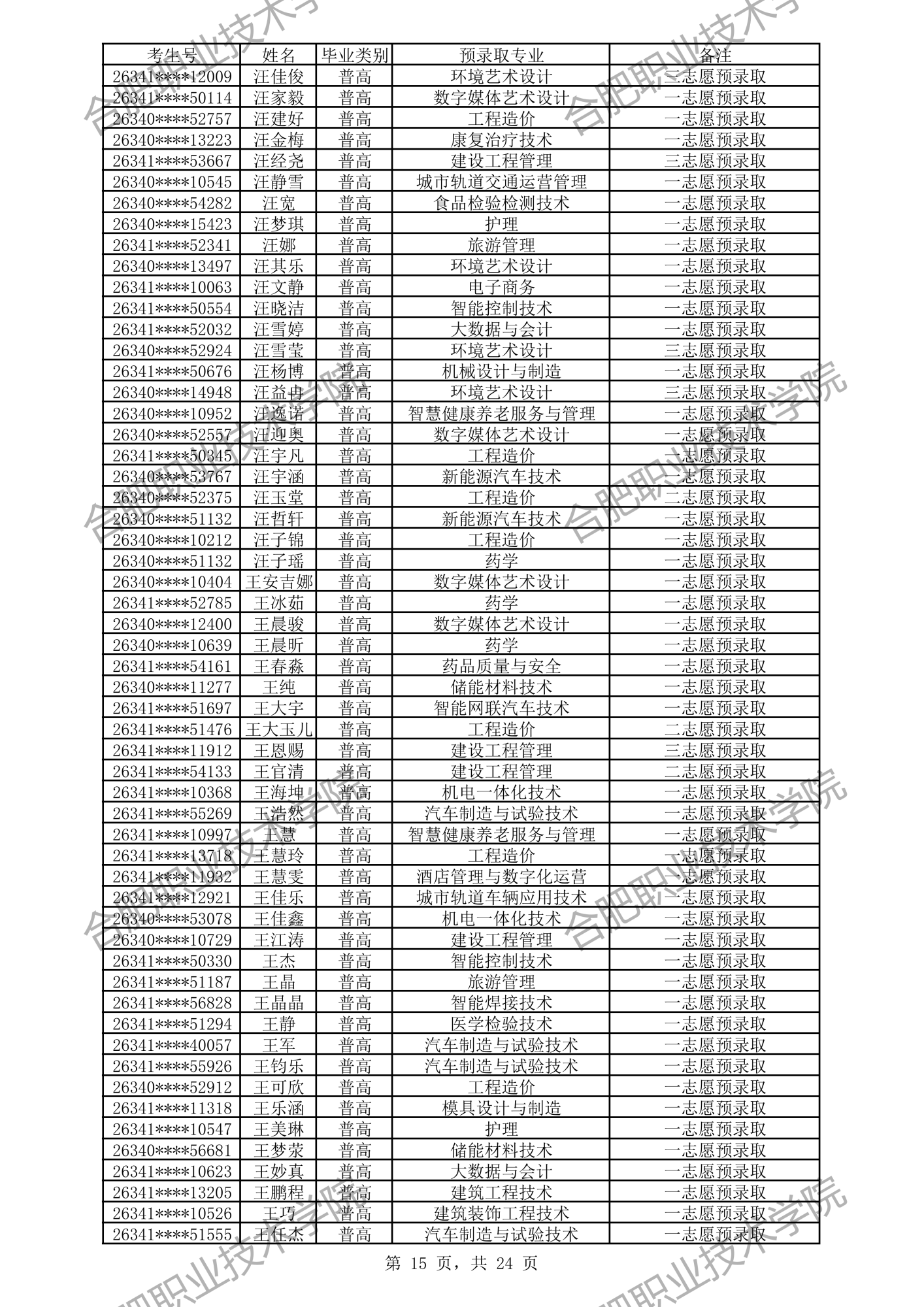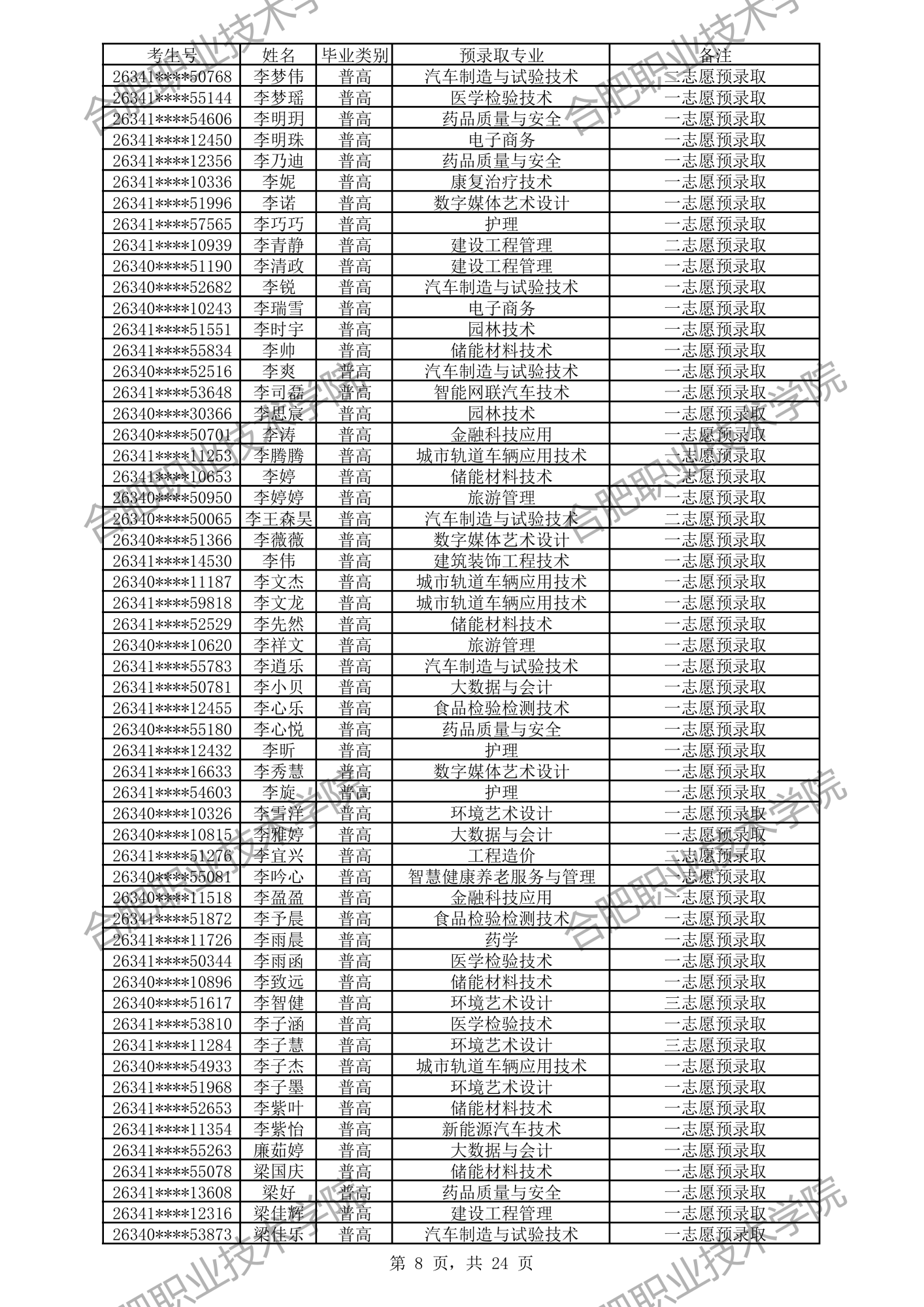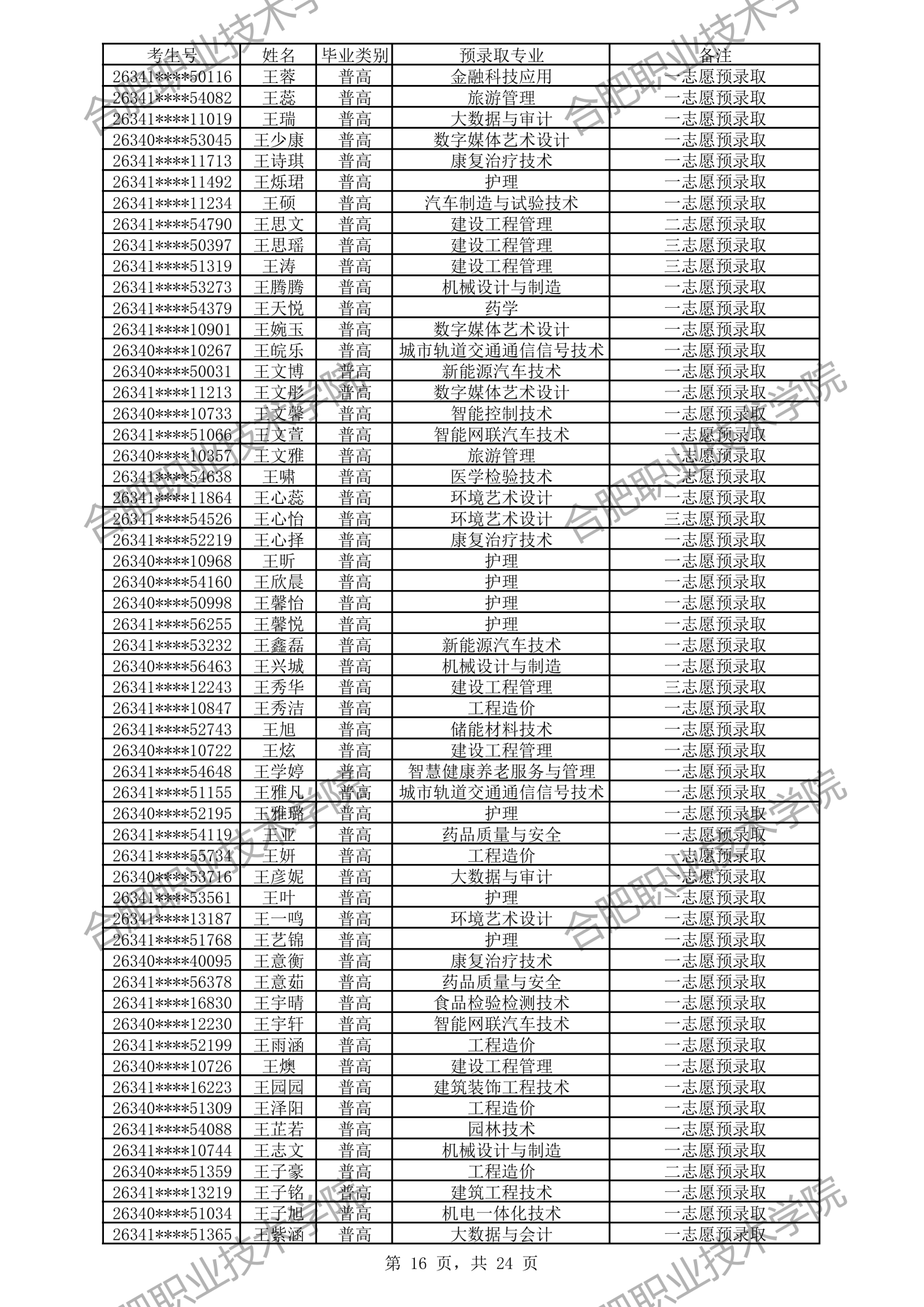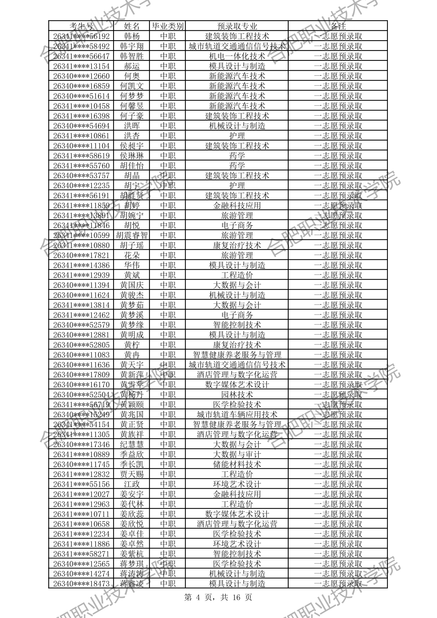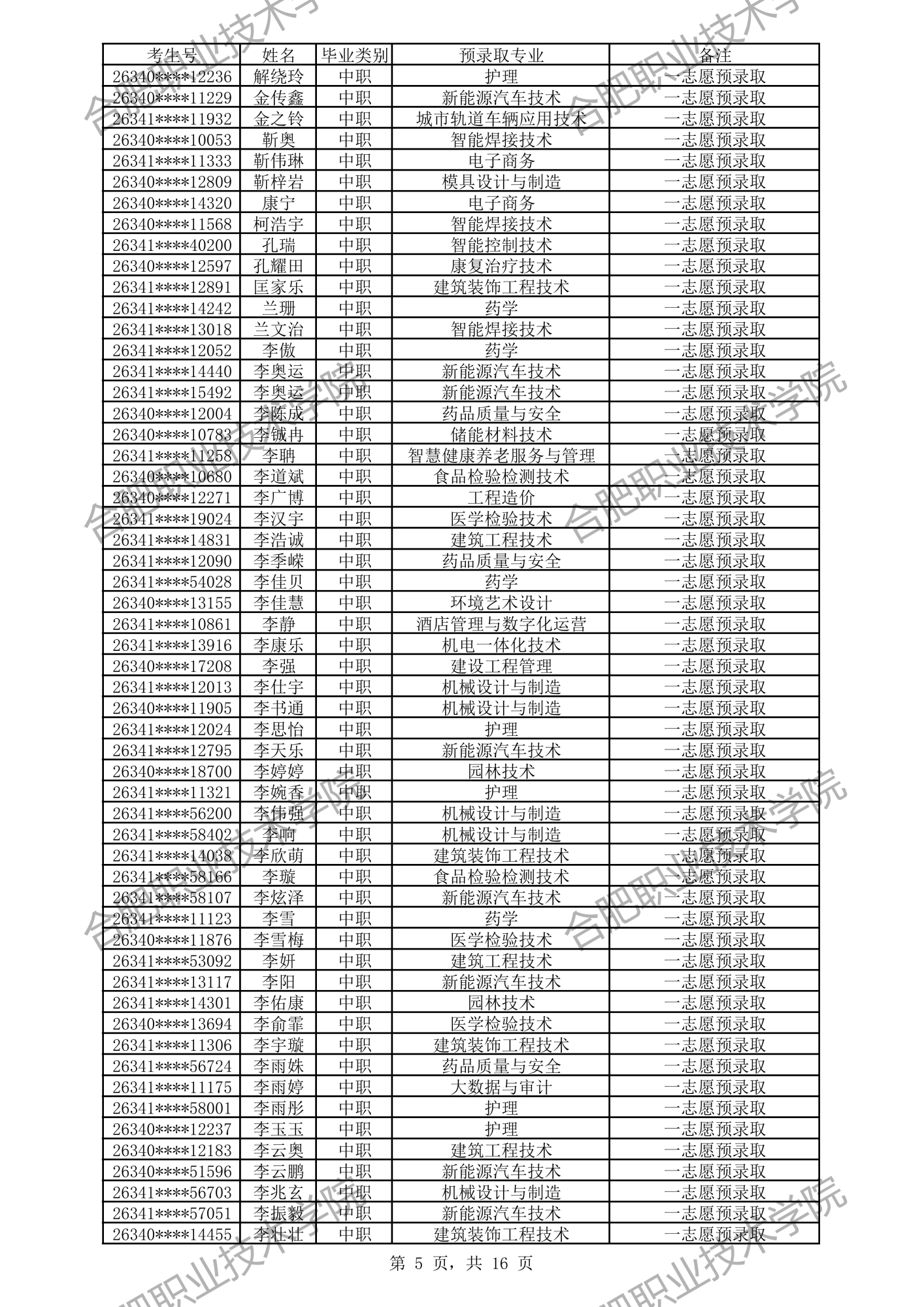 根据我校2026年分类考试招生章程有关规定,经过文化素质考试、职业适应性测试、职业技能考试,形成考生入学测试成绩(考生入学测试成绩 =文化素质测试成绩50%+职业适应性测试或职业技能考试成绩50%)。现将我校预录取及递补预录取名单公示如下,如有异议,请拨打电话0551-82364123,公示时间:4月3日-4月6日。