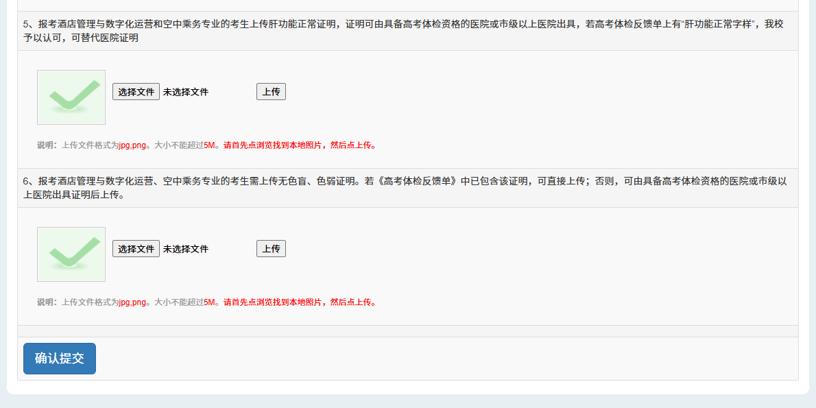 4.报考酒店管理与数字化运营、空中乘务专业的考生,需上传由具备高考体检资质的医院或市级以上医院出具的肝功能正常证明和无色盲、色弱证明。如考生本人的高考体检反馈单中已明确注明“肝功能正常”且“无色盲、色弱”,则无需另行提供医院证明,学校将直接予以认可。若高考体检反馈单中缺少上述任一项目(即“肝功能正常”或“无色盲、色弱”之一),则缺少的项目需单独上传由具备高考体检资质的医院或市级以上医院出具的相应证明。
